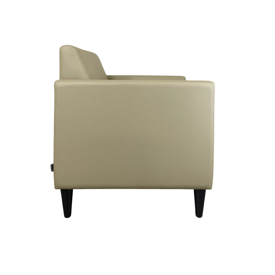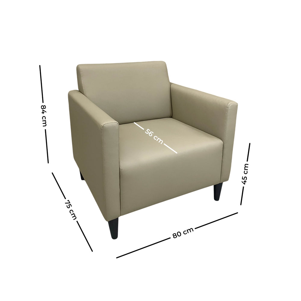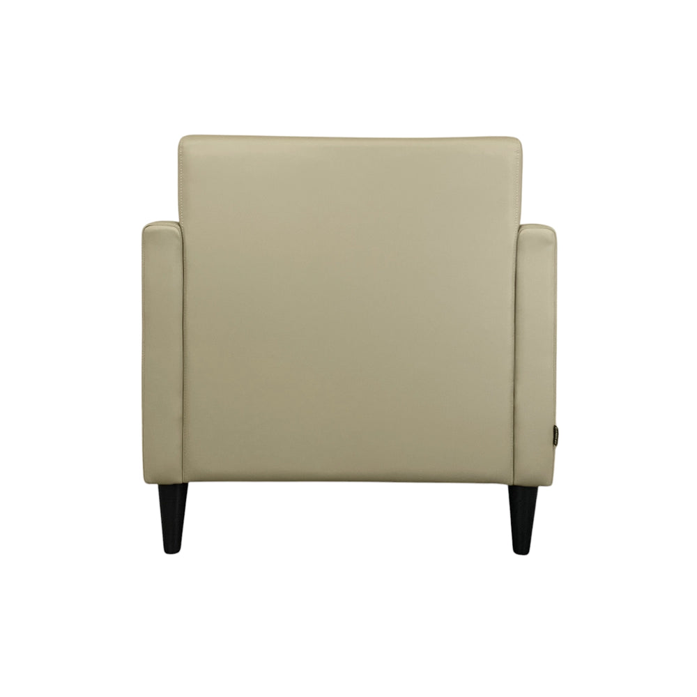 Haru Armchair blends sleek design with premium faux leather upholstery, offering a smooth texture, refined stitching, and easy maintenance. Its contoured backrest and plush cushioning provide excellent support, while sturdy wooden legs ensure stability.