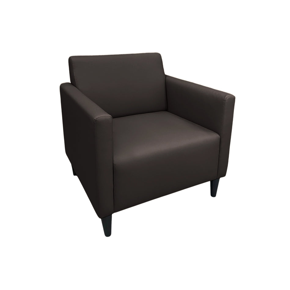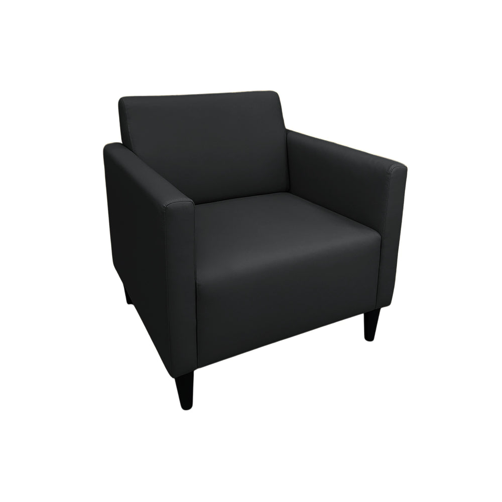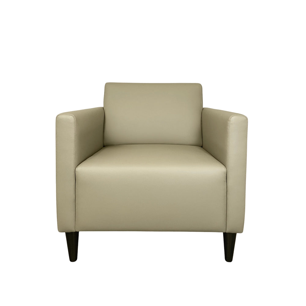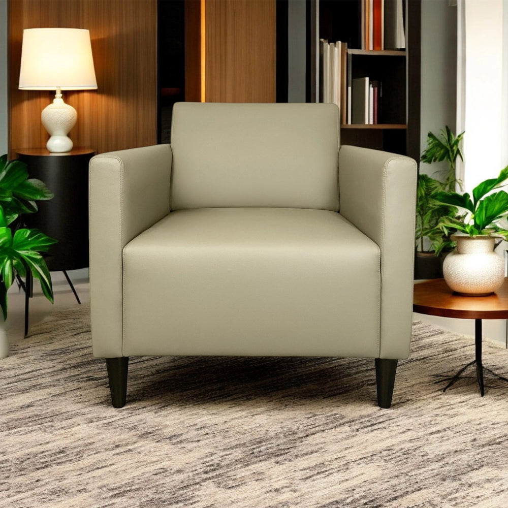 Haru Armchair blends sleek design with premium faux leather upholstery, offering a smooth texture, refined stitching, and easy maintenance. Its contoured backrest and plush cushioning provide excellent support, while sturdy wooden legs ensure stability.