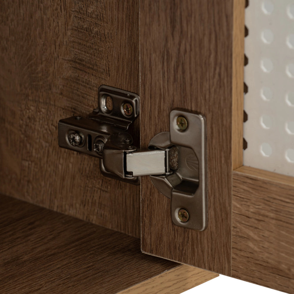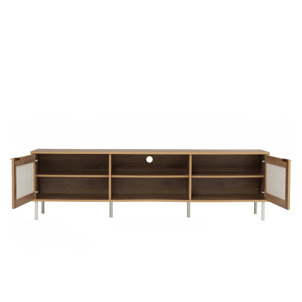 Crafted for modern living, the Hudson TV Cabinet (1.8m) blends mid-century charm with clean functionality. Featuring natural wood tones, perforated rattan-style doors, and sleek metal legs, it offers generous storage with open shelving and cable management. A stylish, space-saving media console for any living room.