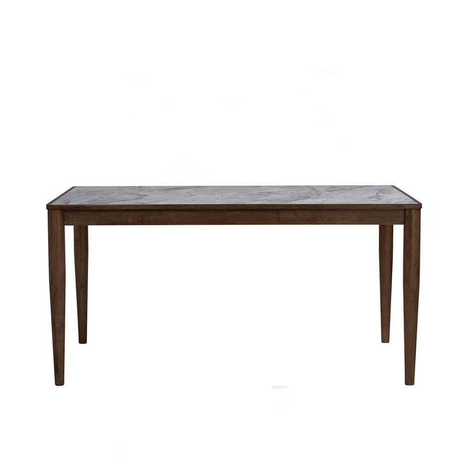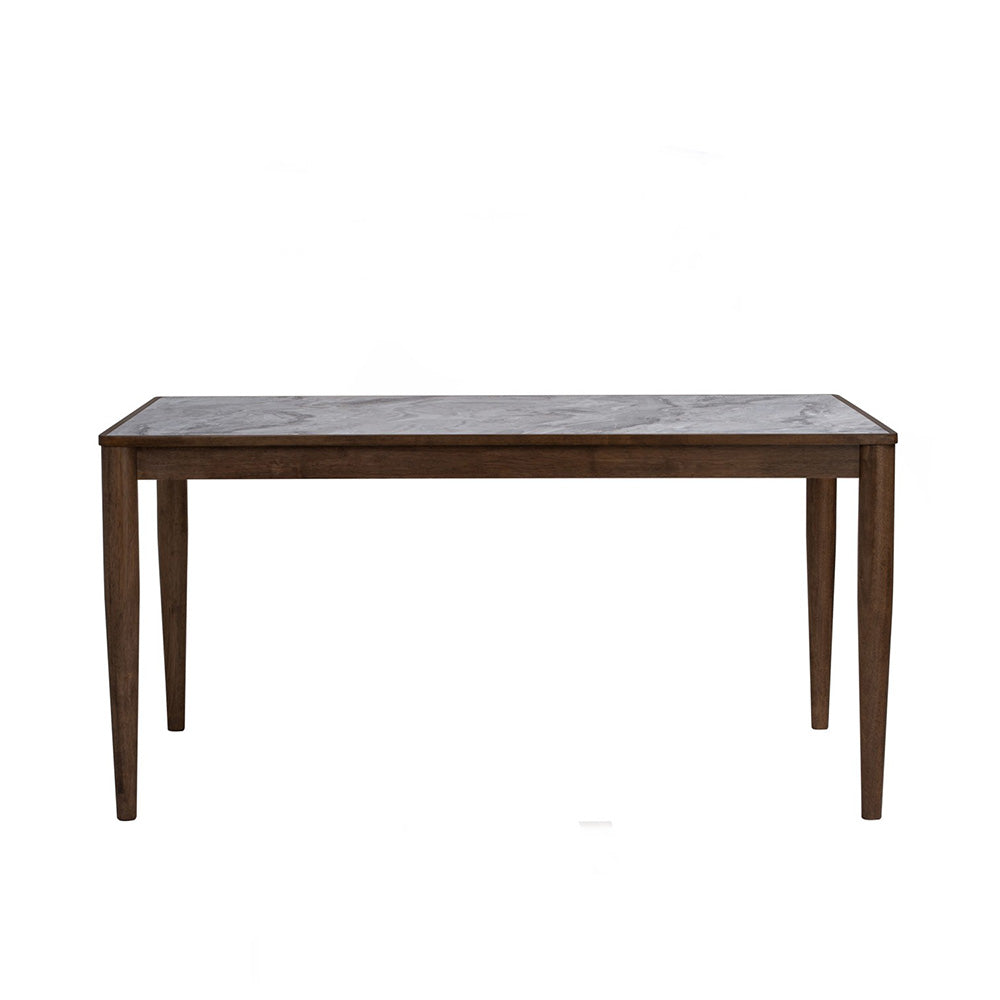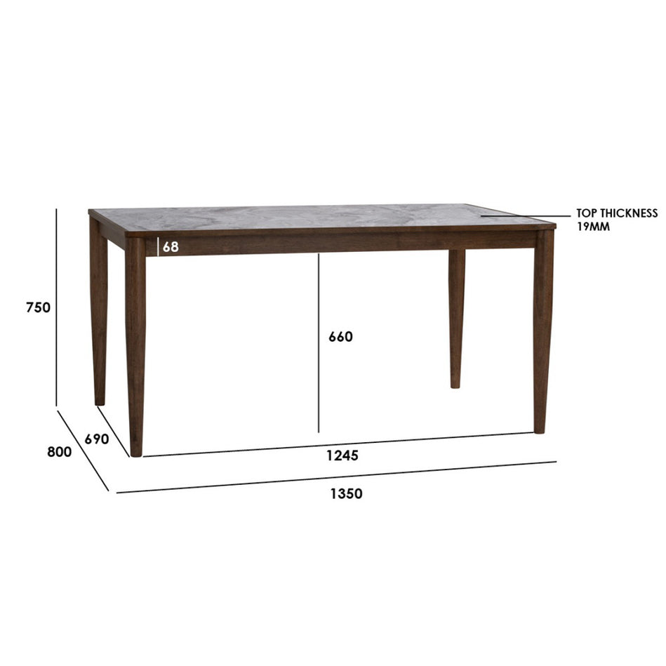 DINING TABLE Dimensions L135 x D 80 x H 75 cm (6 Seater Table) Materials Melamine Table Top in Marble Texture Solid Oak Wood Base