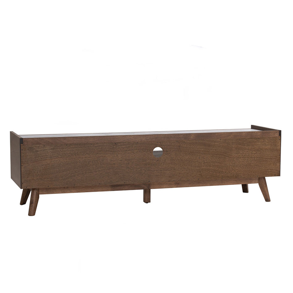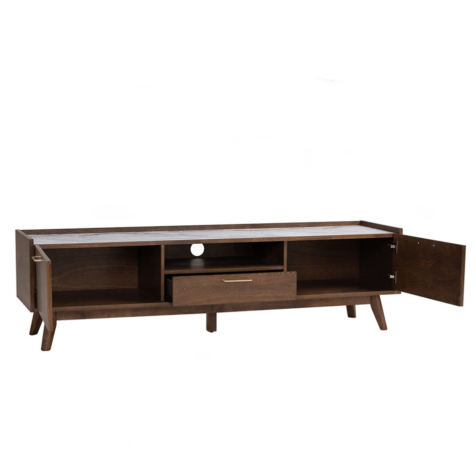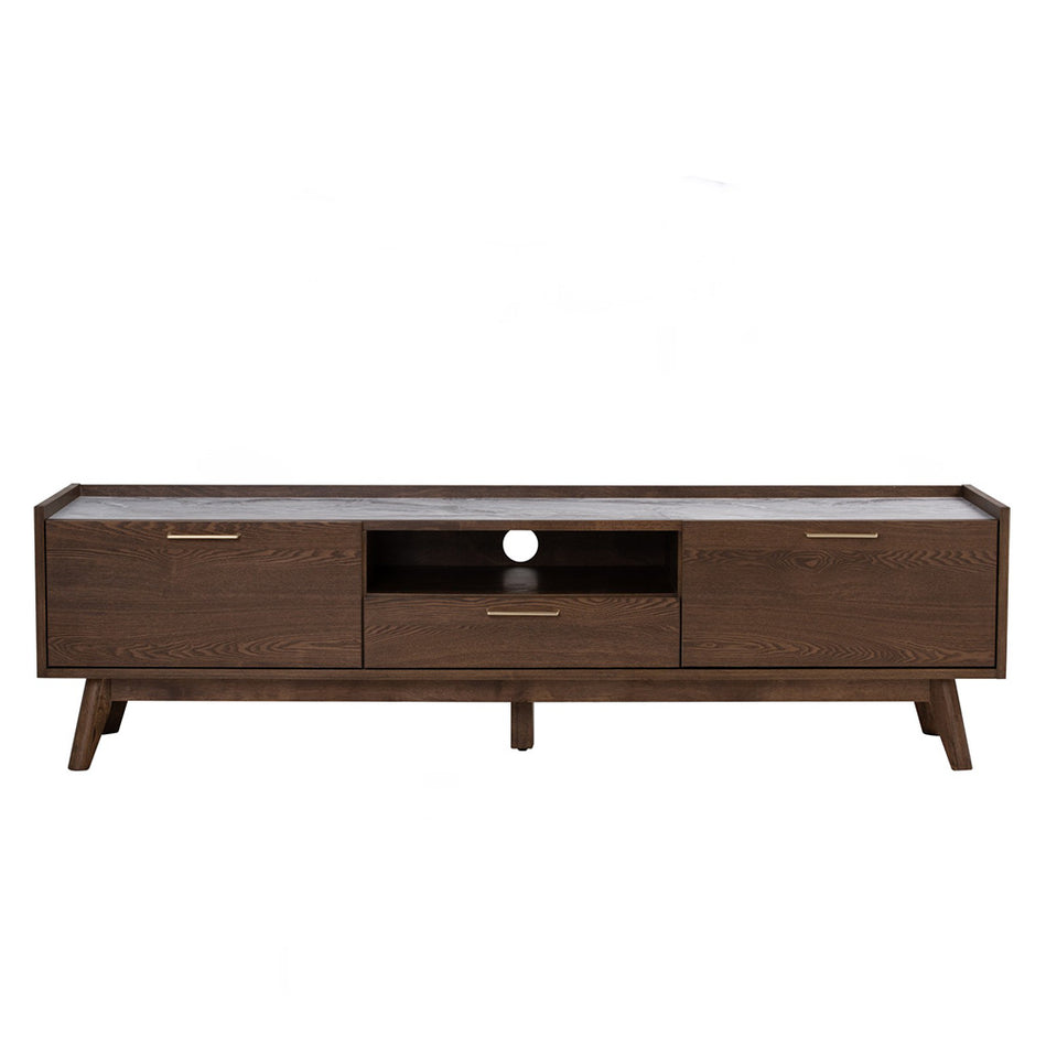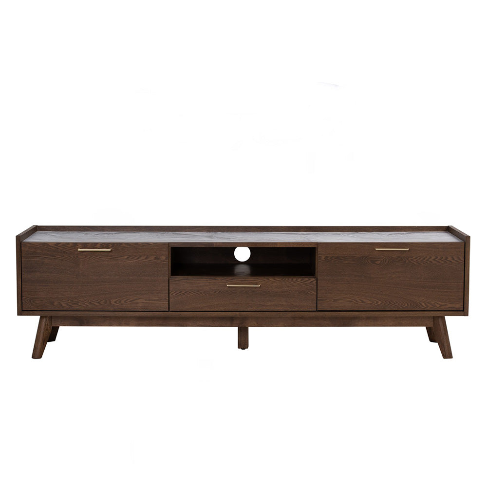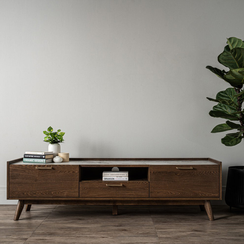 Andrea 1.8m TV Cabinet is a modern retro piece with Walnut-colored legs and body, paired with a White Marble-colored Melamine top. Stylish and functional, it offers ample storage for media devices, adding sophistication to any space.