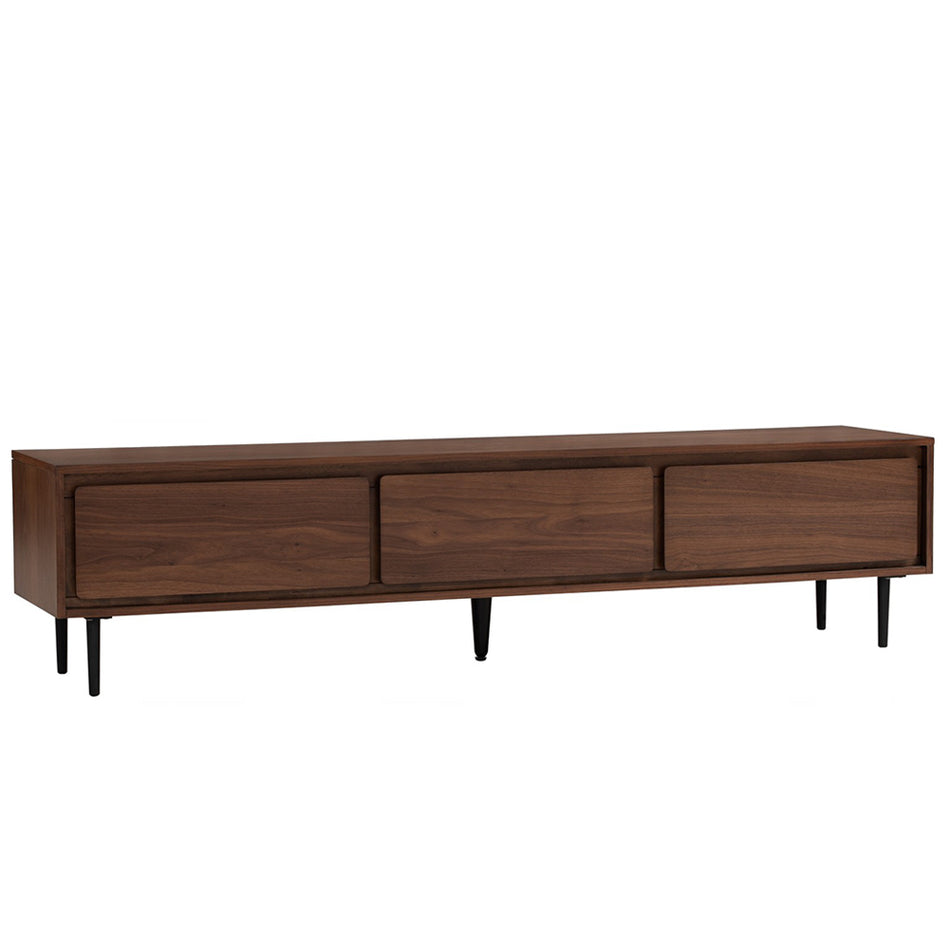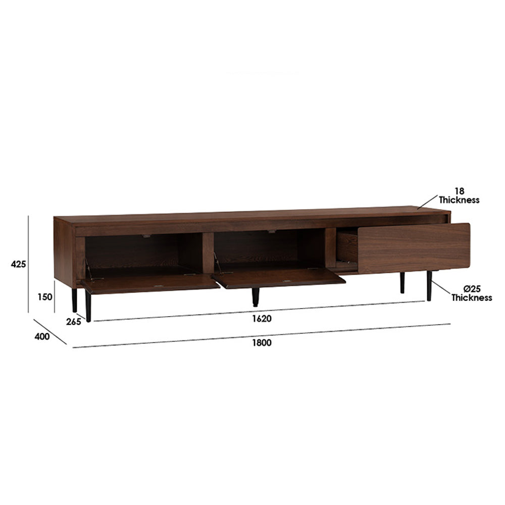 Aster 1.8m TV Cabinet radiates classic elegance with its rich dark wood tones, capturing a timeless charm. Simple yet timeless, it includes storage doors with chamfered edges and rounded corners for added visual appeal.