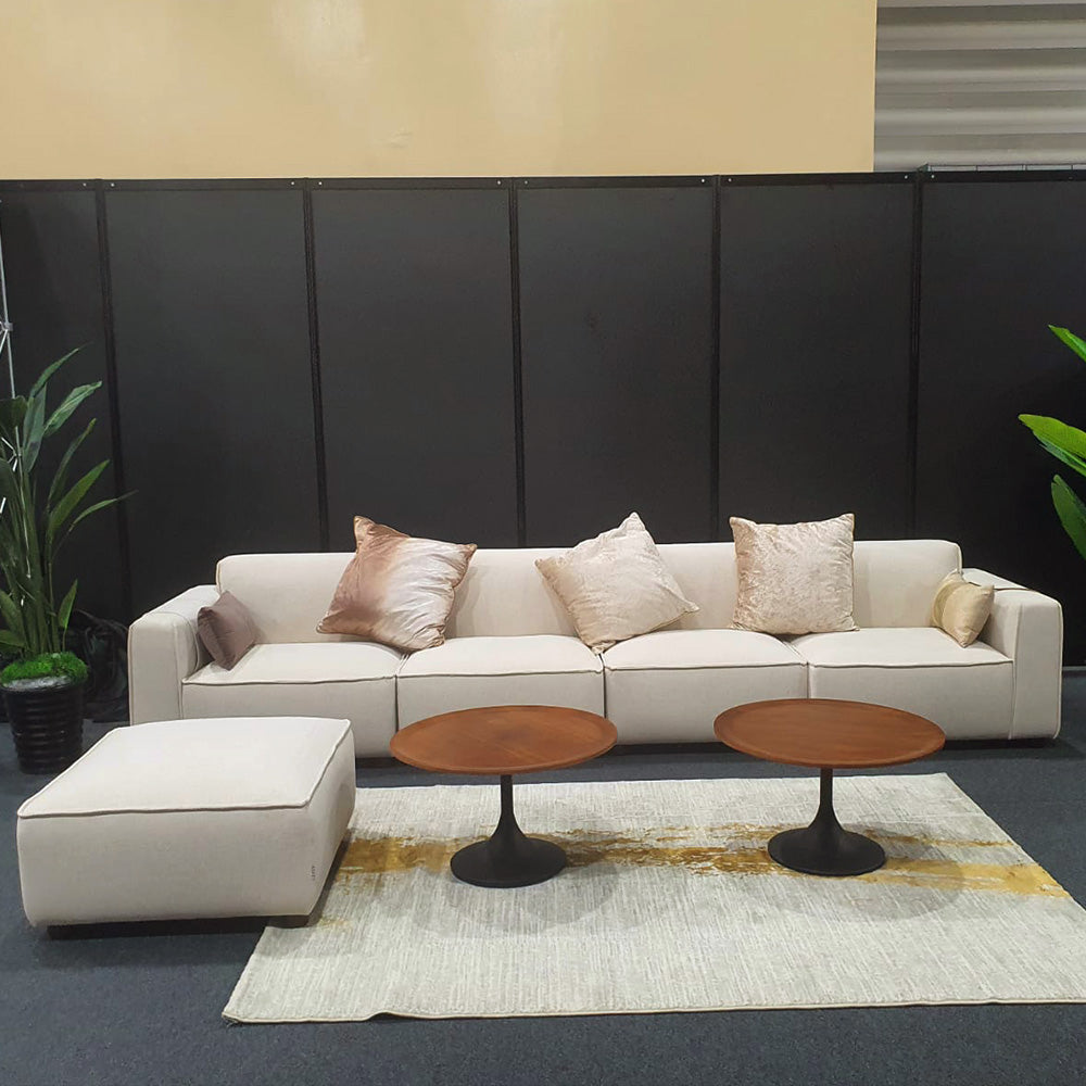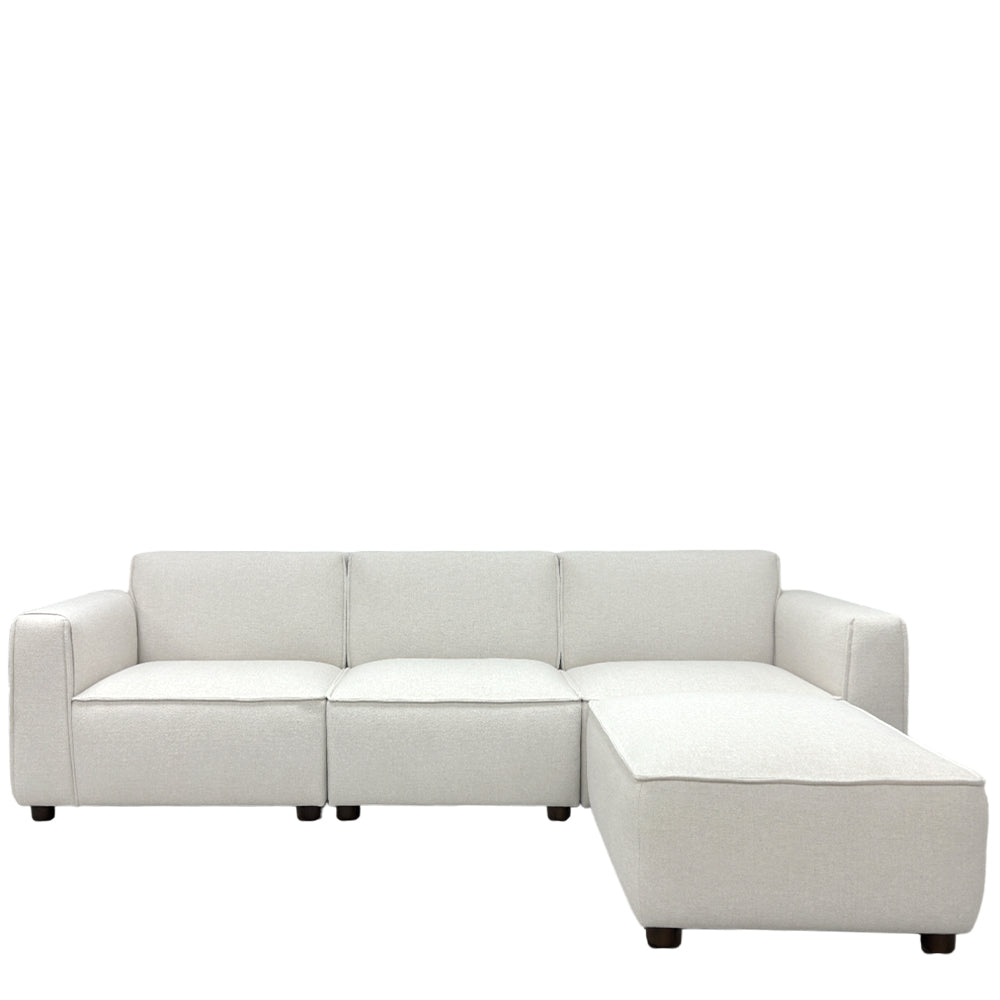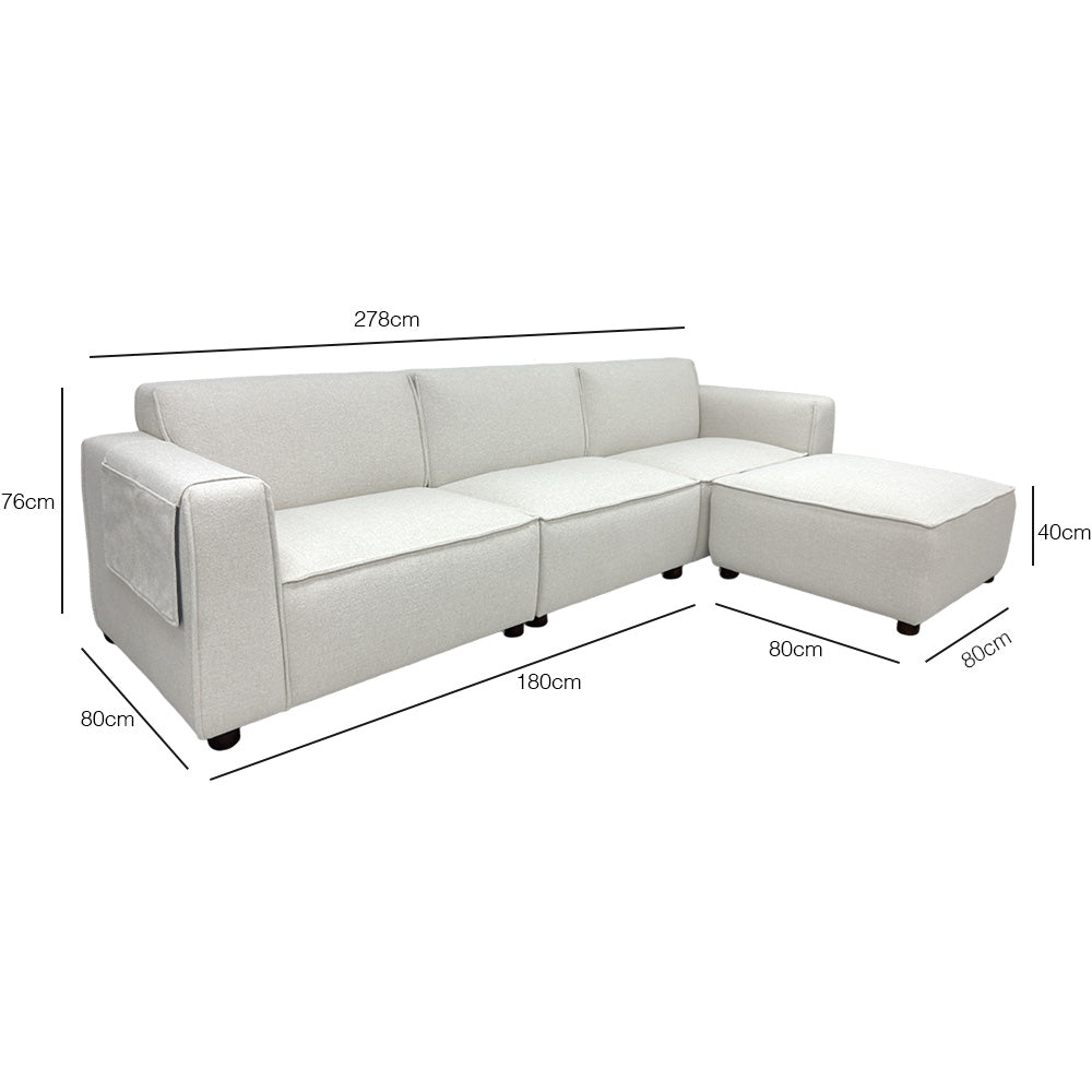 Clean, crisp, and ideal for lounging, the Bruno 4 Seater Modular Sofa With Ottoman is designed with an architect's precision, perfectly proportioned for both small and large living spaces. Its minimalist silhouette exudes a fresh, casual vibe, featuring A-profile arms with new piping details. The modular components enable you to rearrange the sofa to suit your evolving needs. Additionally, a small side pocket provides convenient storage for magazines or a remote control.