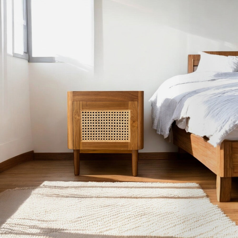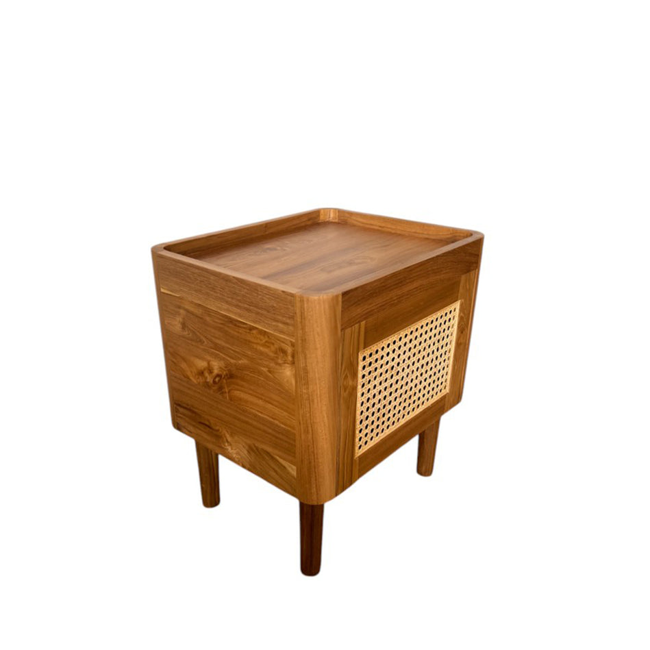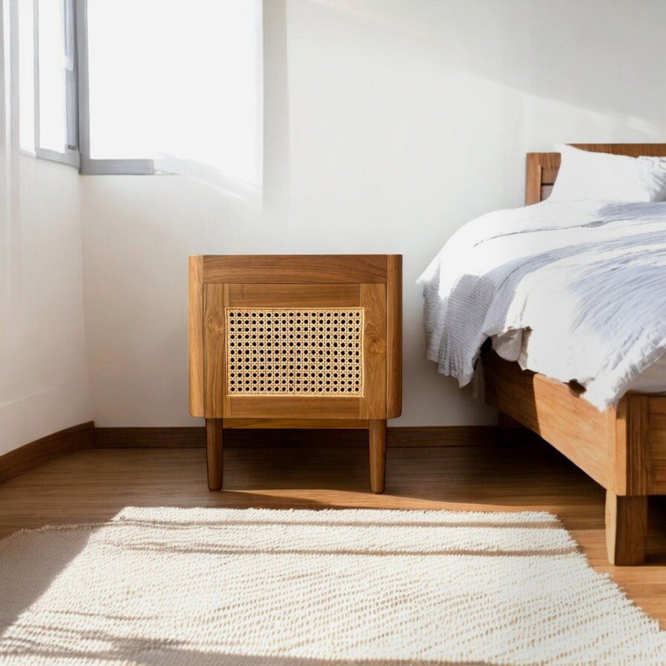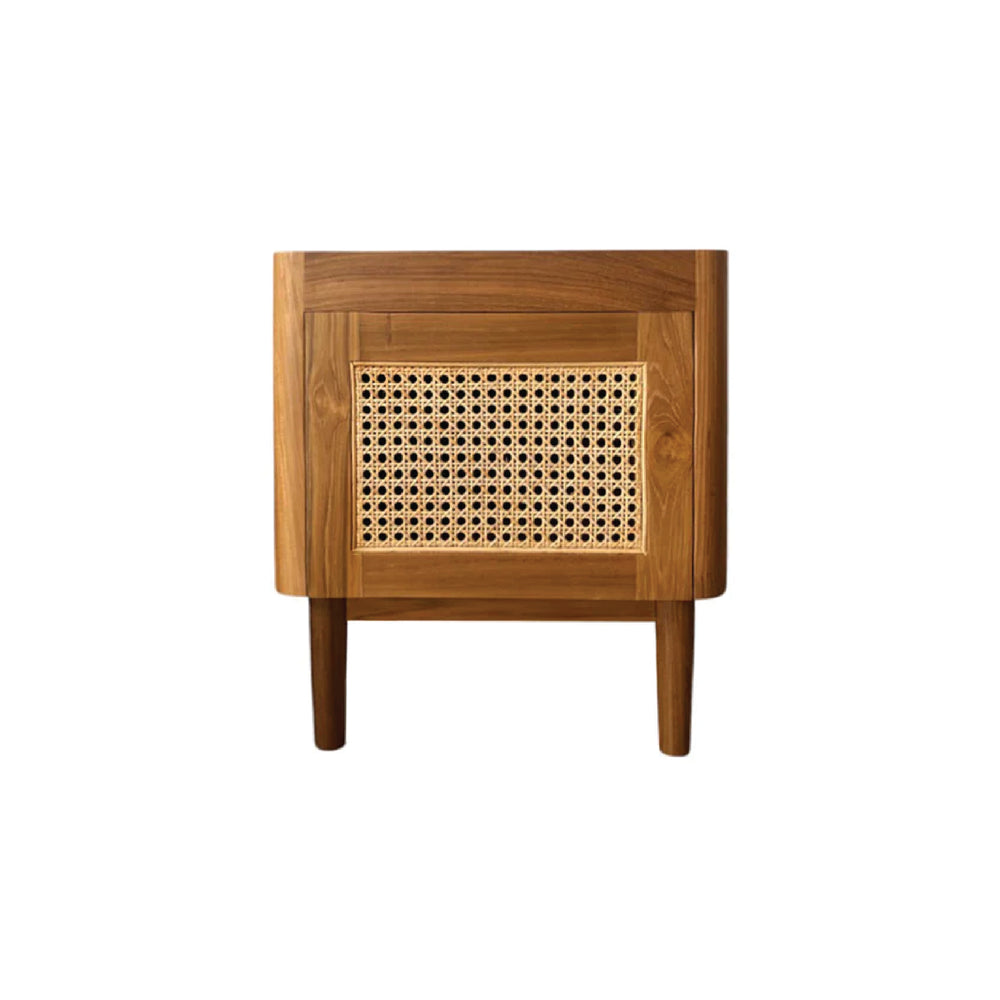 Crafted from solid teak wood and adorned with handwoven rattan, the Bruno Teak Bedside Table embodies timeless charm with a touch of rustic elegance. Its natural finish highlights the rich grain of teak, while the rattan panel adds texture and warmth, creating a harmonious blend of style and practicality.