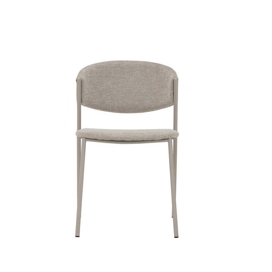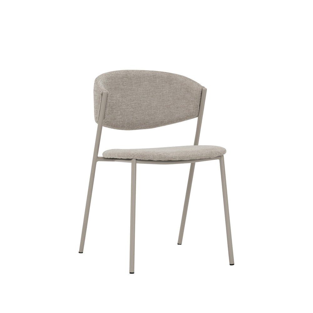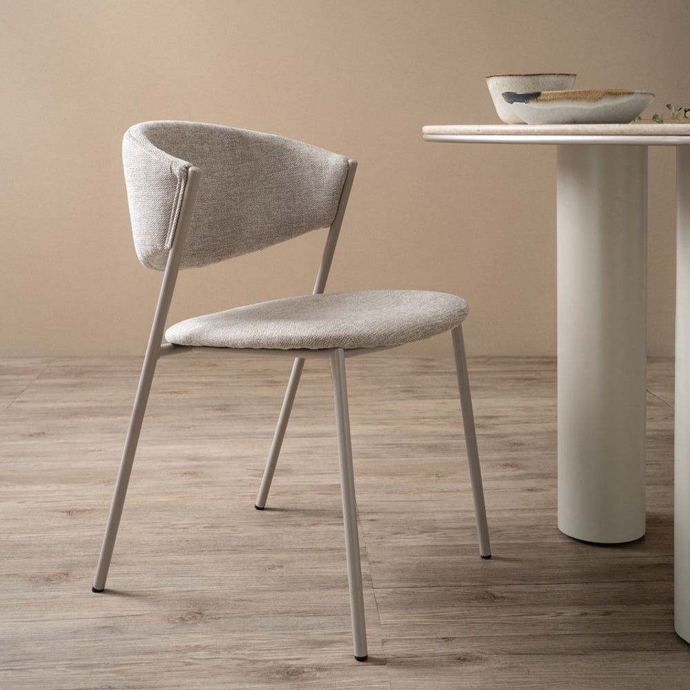 Sculptural yet subtle. Edith Dining Chair blends curved form with airy lightness. Upholstered in a soft neutral fabric, its semi-backrest offers comfort with modern charm. A timeless accent for contemporary dining spaces..