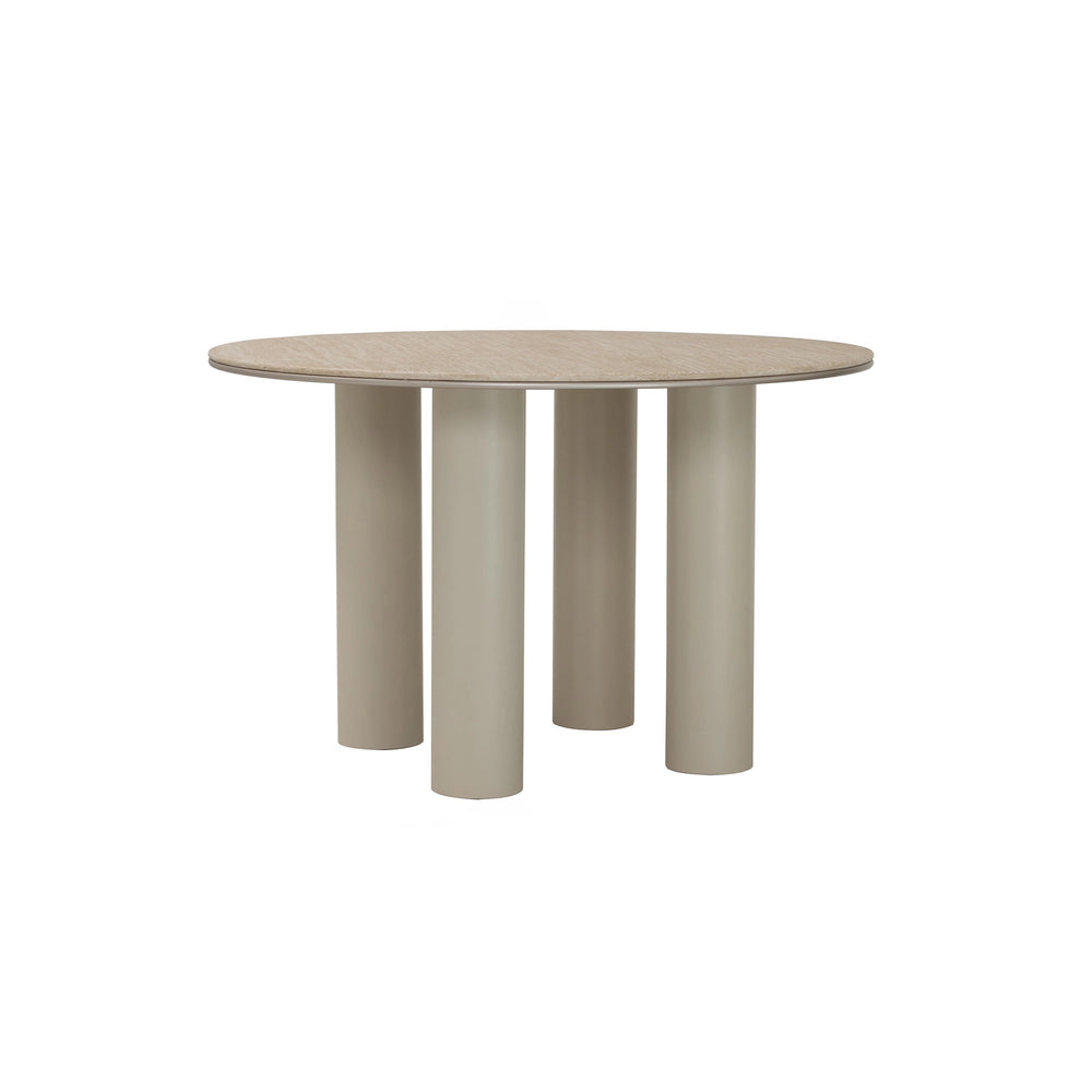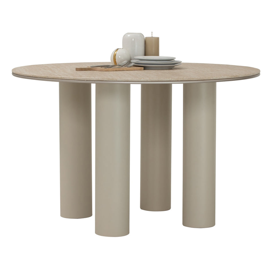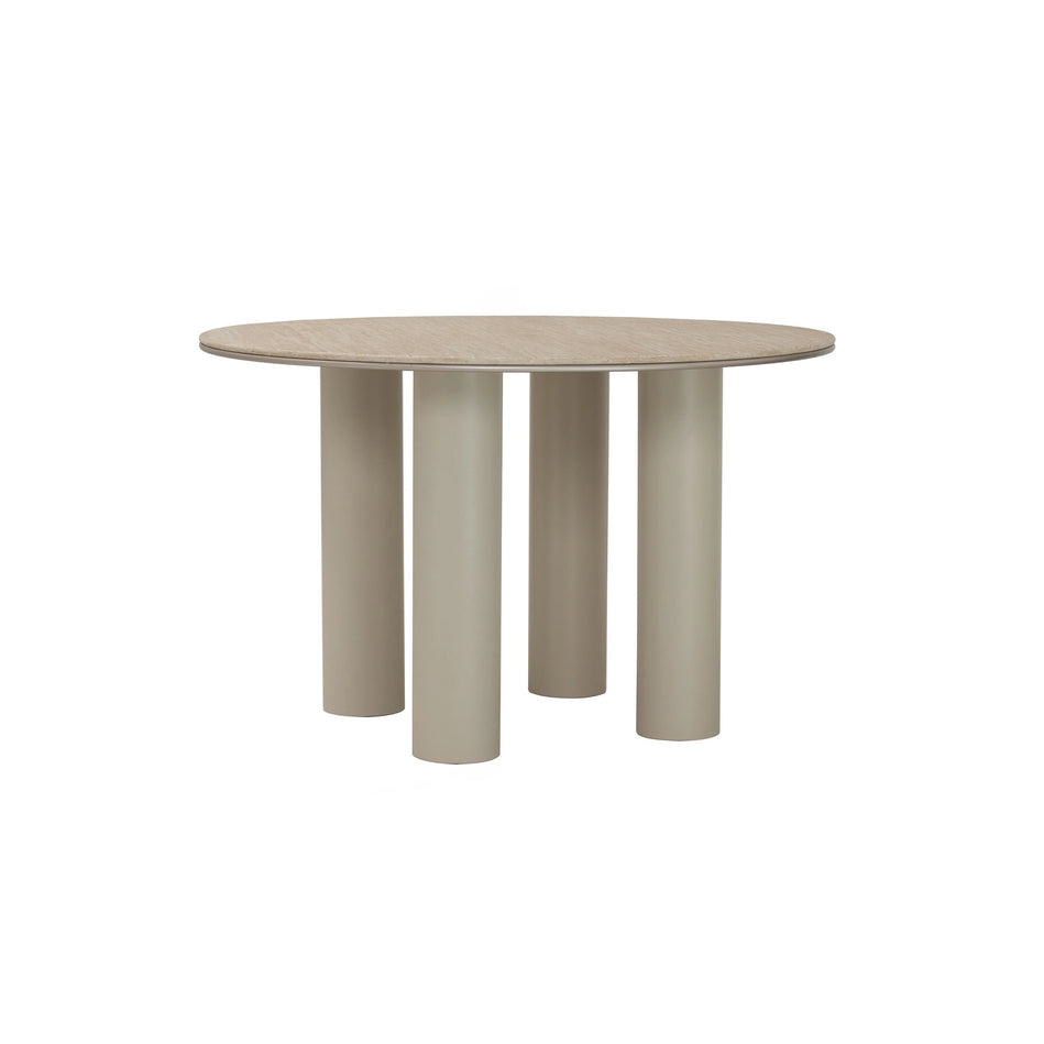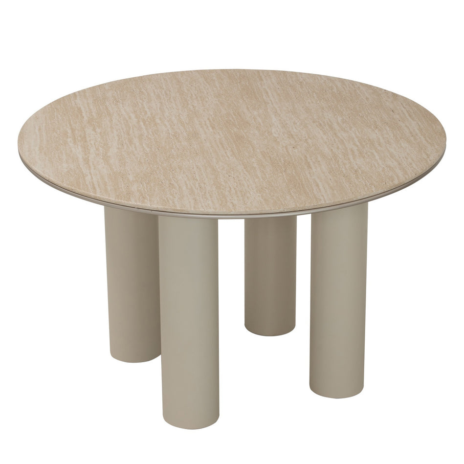 Grounded in geometry. Edith Dining Table features a round marble top resting on bold cylindrical legs. Sculptural yet balanced, it’s a statement piece that invites gathering and conversation.