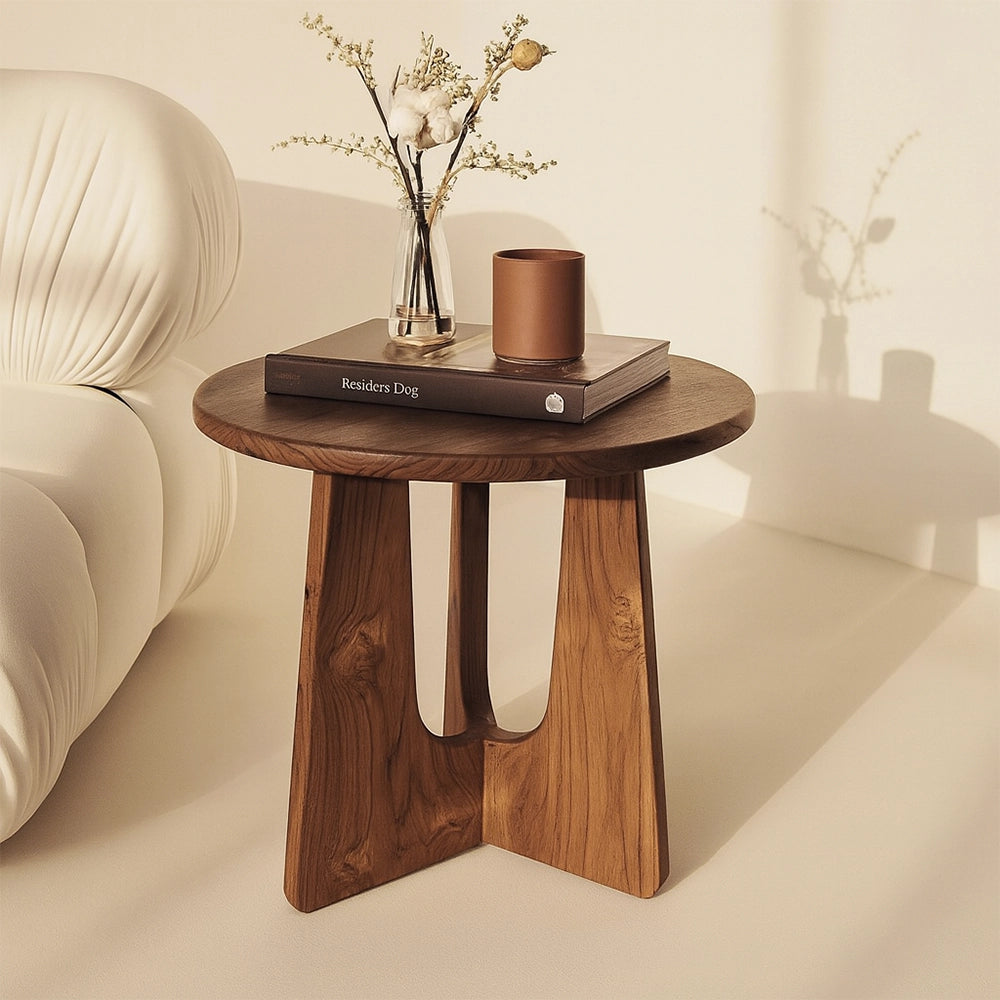 Fermo Teak Side Table features a smooth, round top and a unique base with three converging U-shaped legs, perfect as an elegant companion for your sofa or armchair. Its solid teak construction ensures durability and showcases beautiful natural wood grain.