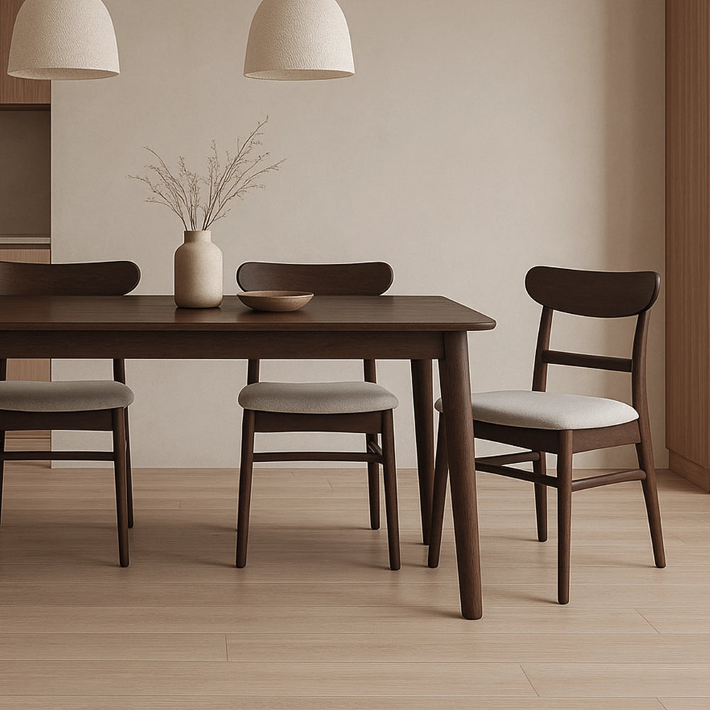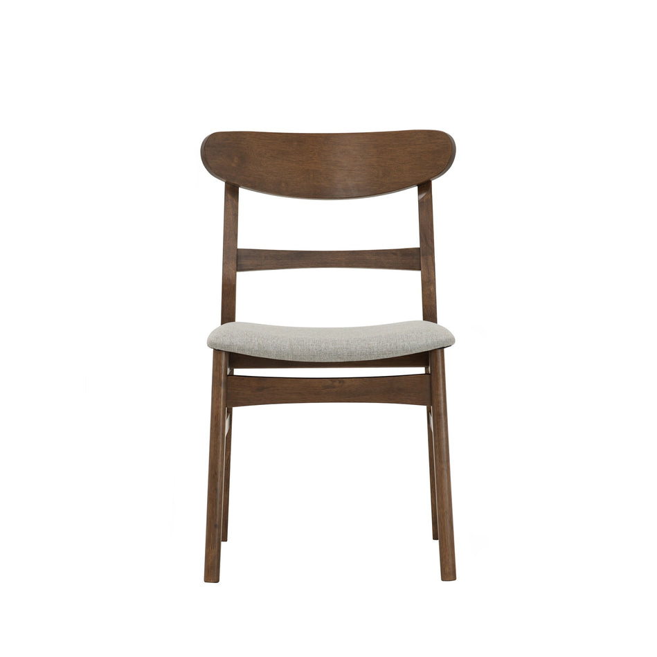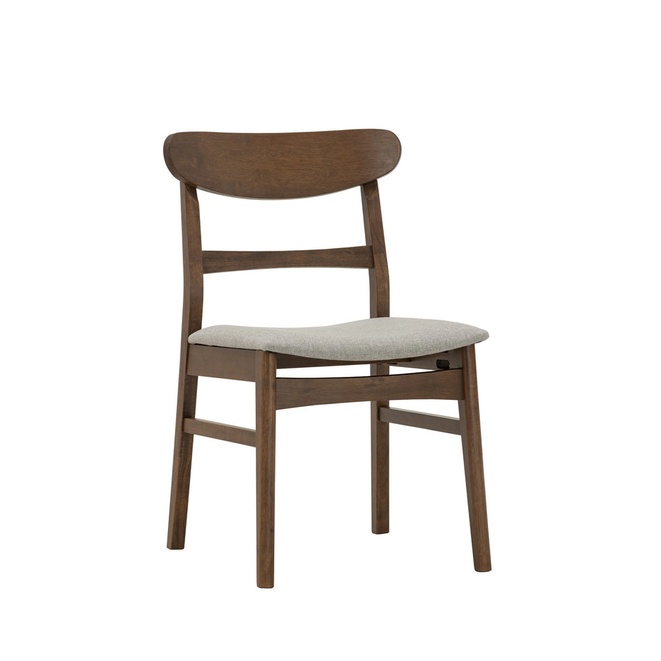 Hansen dining chair offers solid wood construction with a rich walnut finish, perfect for modern and mid-century dining rooms. Featuring a curved ergonomic backrest and plush grey fabric cushion, this hardwood dining chair ensures comfort and style. Ideal for contemporary dining sets, and cozy home interiors.