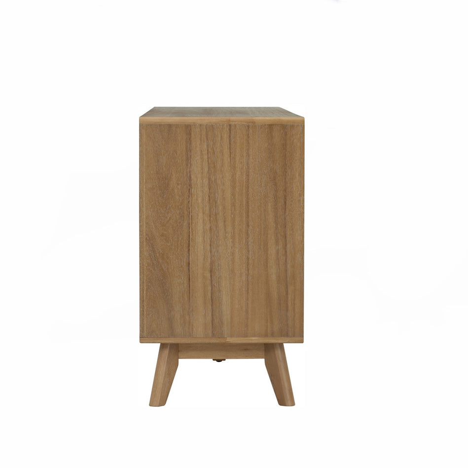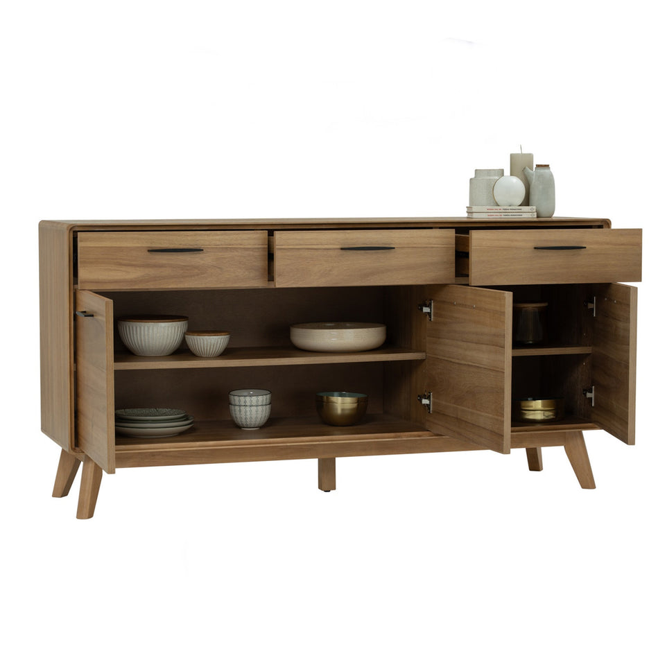 Jana Sideboard 1.6m features 3 drawers and 3 swing doors for balanced form and function. Crafted with a solid oak base and acacia veneer body, it offers warm tones and clean lines.
