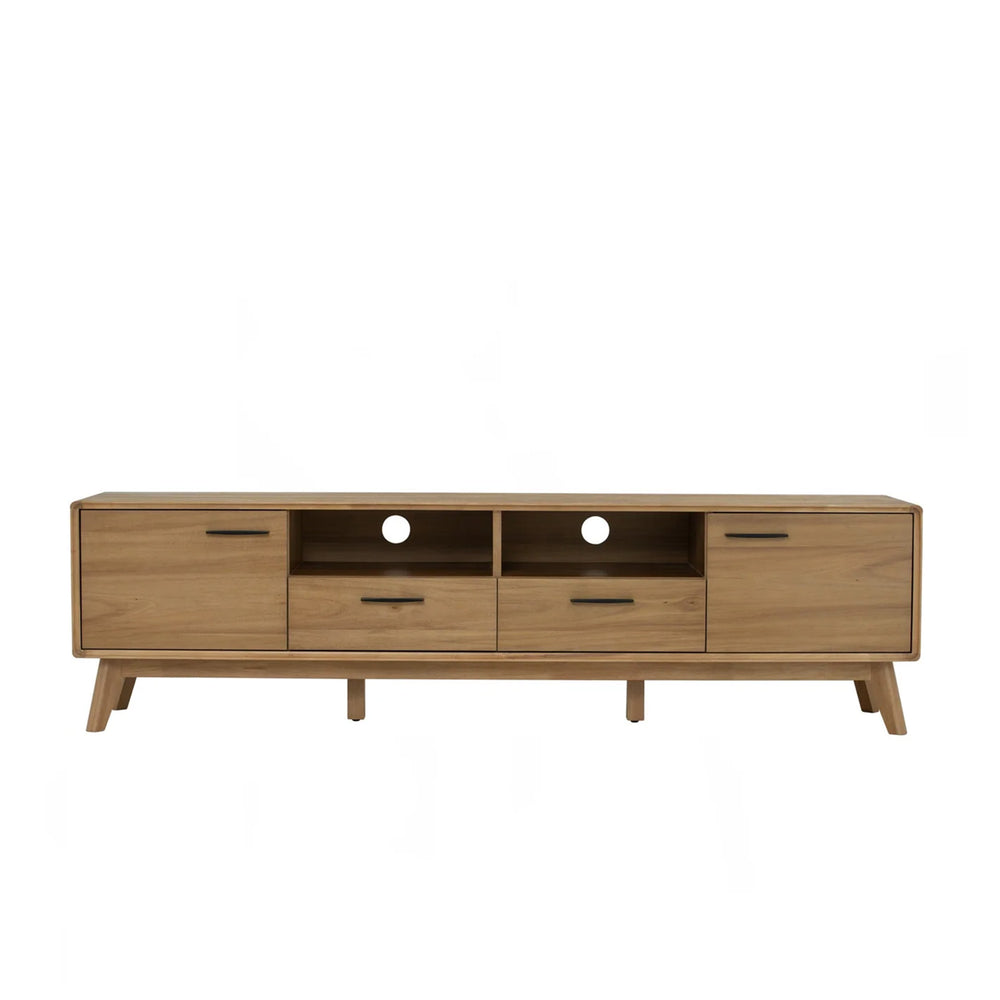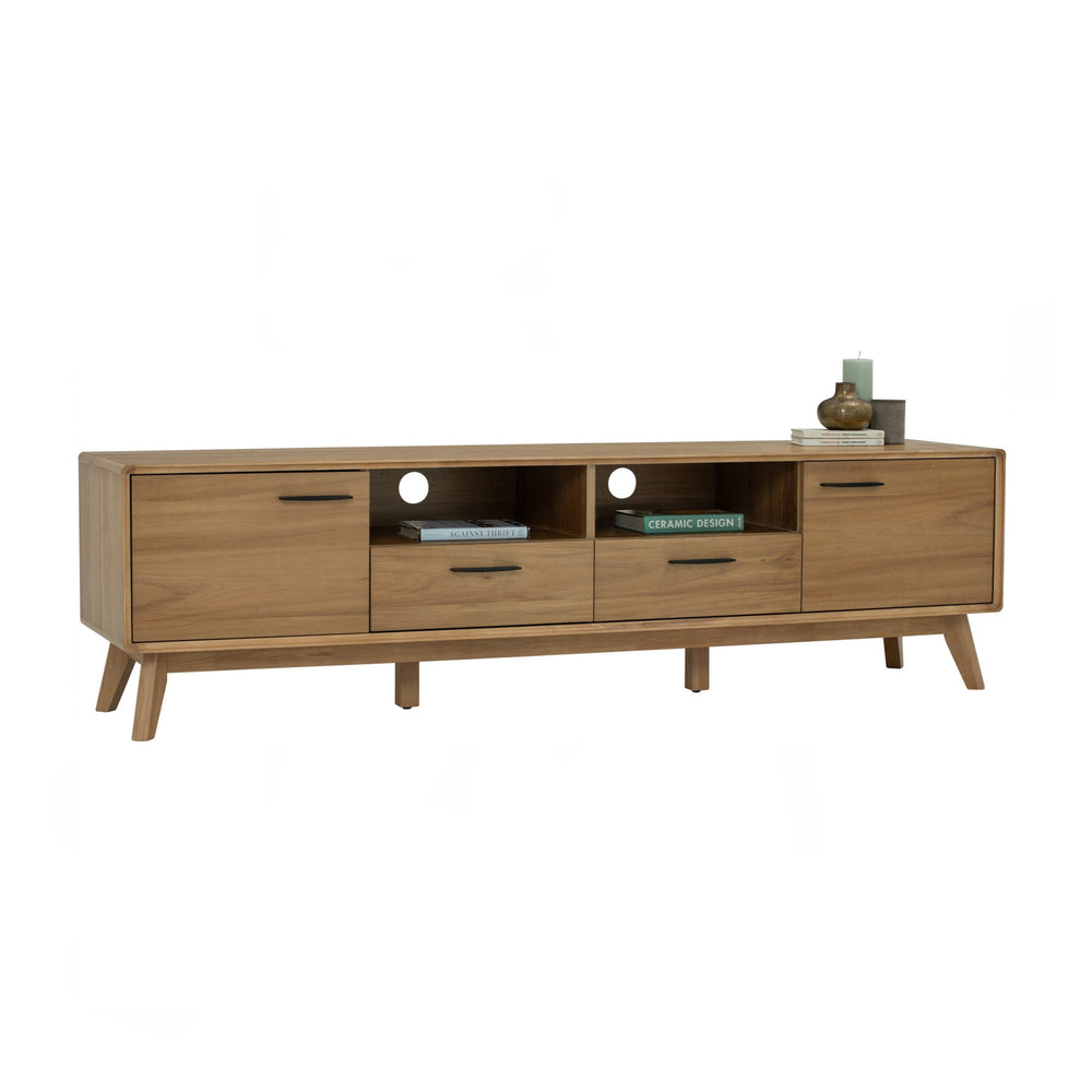Jana TV Cabinet blends mid-century charm with modern function. Built on a solid oak base with acacia veneer, it features 2 open shelves, and 2 swing doors for smart storage. Cable cutouts keep clutter hidden.