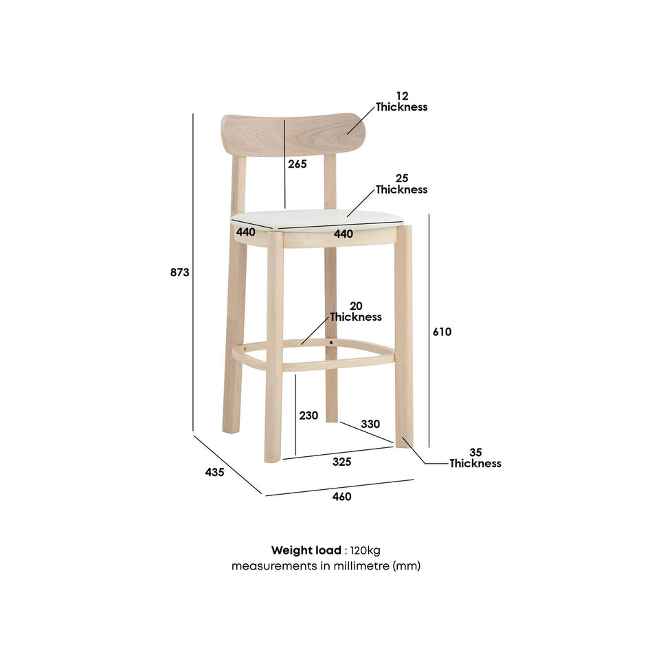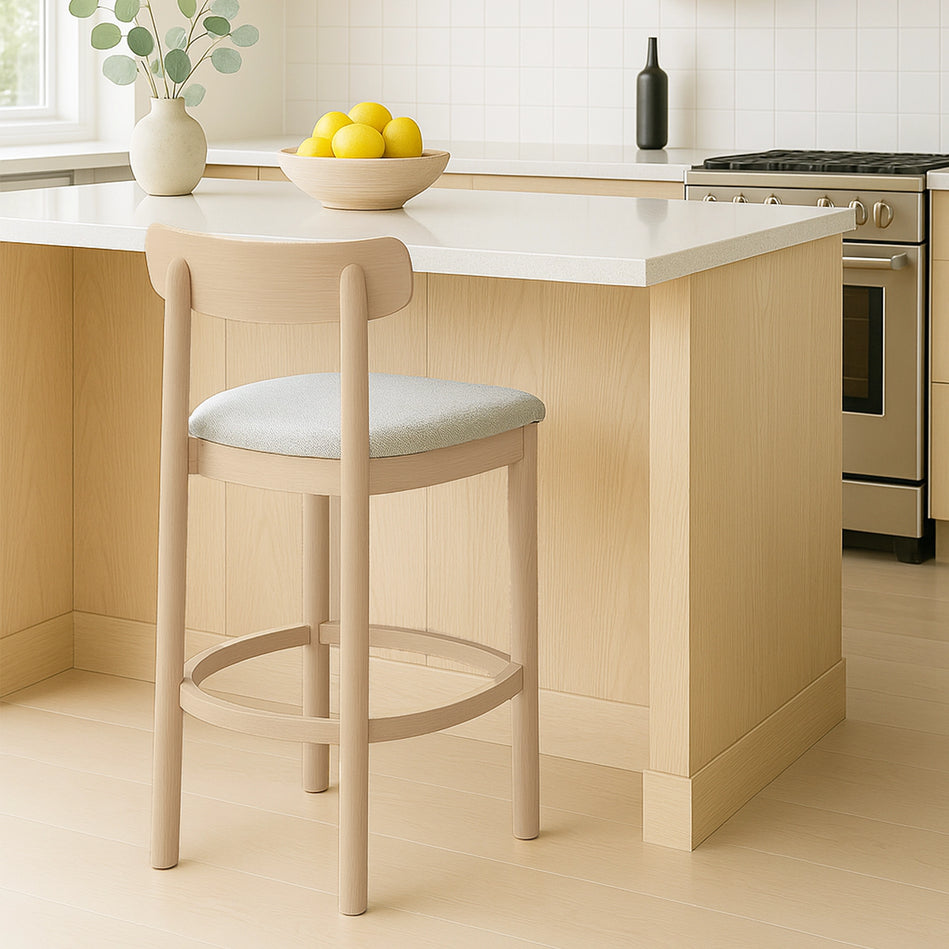 Elevate your kitchen or bar space with the Luna Counter Stool. Featuring a natural wood frame, curved backrest, and a textured upholstered seat, it delivers modern farmhouse charm with lasting comfort. Perfect for counter-height seating in dining areas, kitchen islands, or breakfast bars. Dimensions L 46 x D 43.5 x H 87.3 cm SH 61 cm
