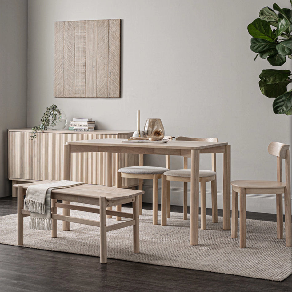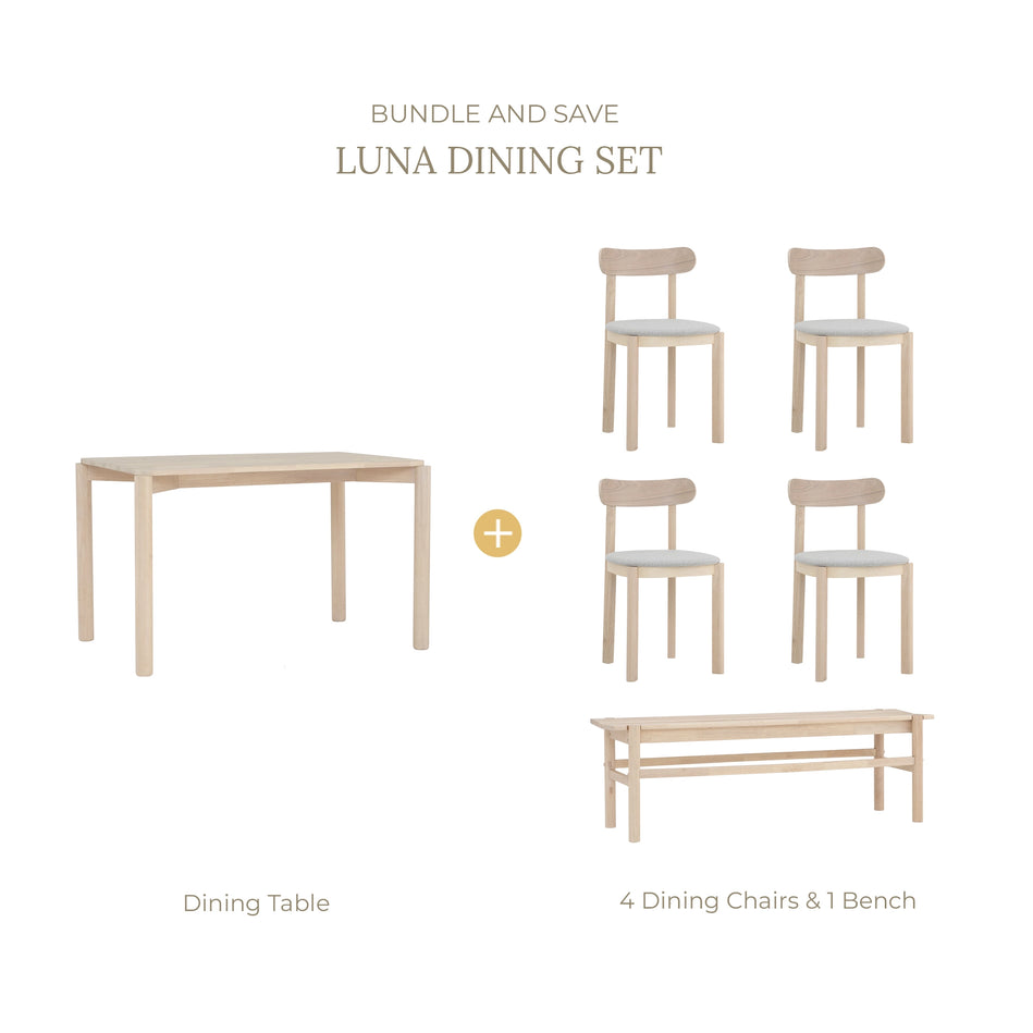 The Luna Dining Set with Long Bench embraces soft minimalism with Scandinavian charm. Crafted in a light wood tone, it features a clean-lined table, cushioned seats, and matching bench and perfect for cozy dining spaces. Timeless, airy, and made to elevate everyday meals.