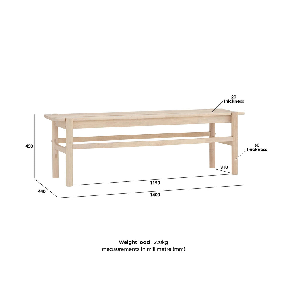 DINING BENCH 1.4m Dimensions L 140 x D 44 x H 45 cm SH 45 cm Materials Light natural oak Solid Wood Seat Veneer Coating