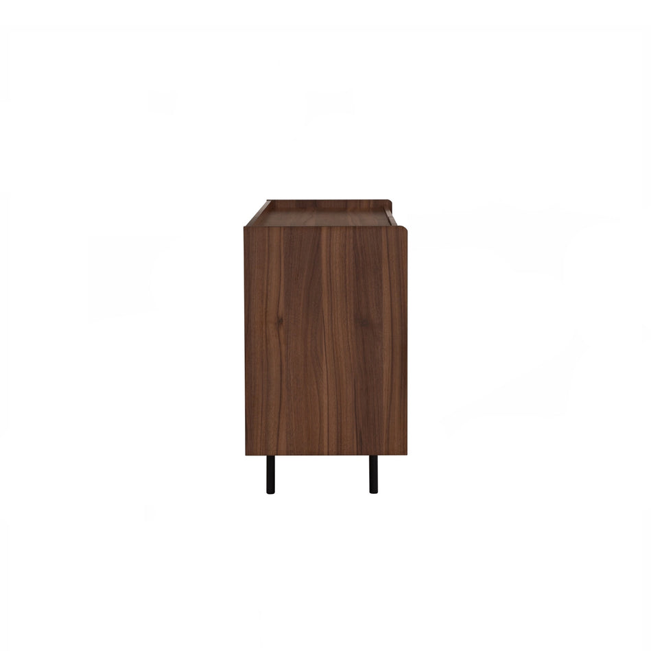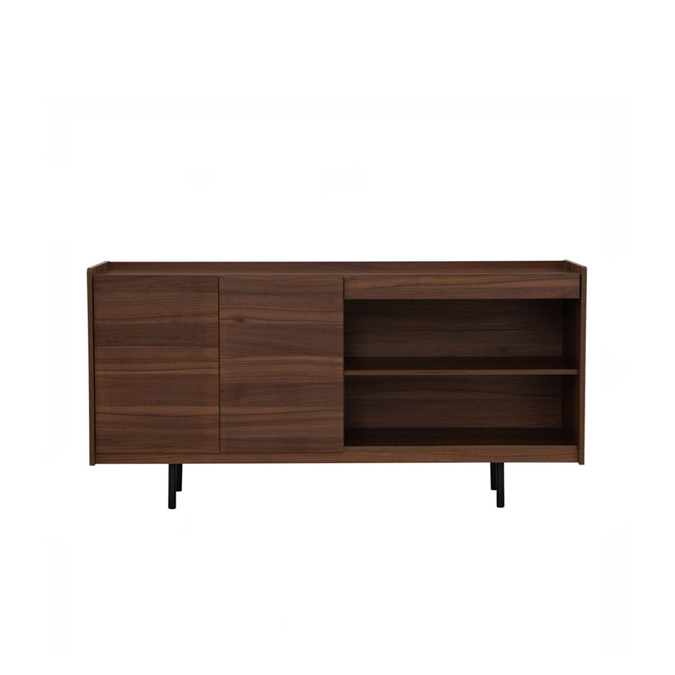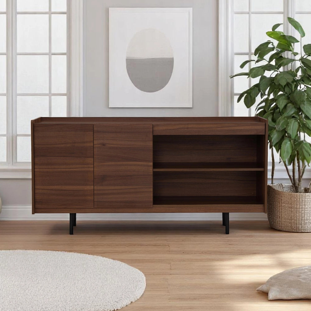 The Malix Sideboard blends mid-century style with modern storage. Finished in rich walnut, it features 2 soft-close doors, open shelves, and sleek black metal legs. Perfect as a credenza, buffet cabinet, or TV console in your living room, dining area, or hallway. A stylish storage solution for contemporary and minimalist homes.