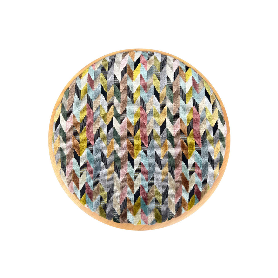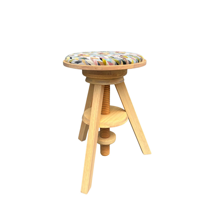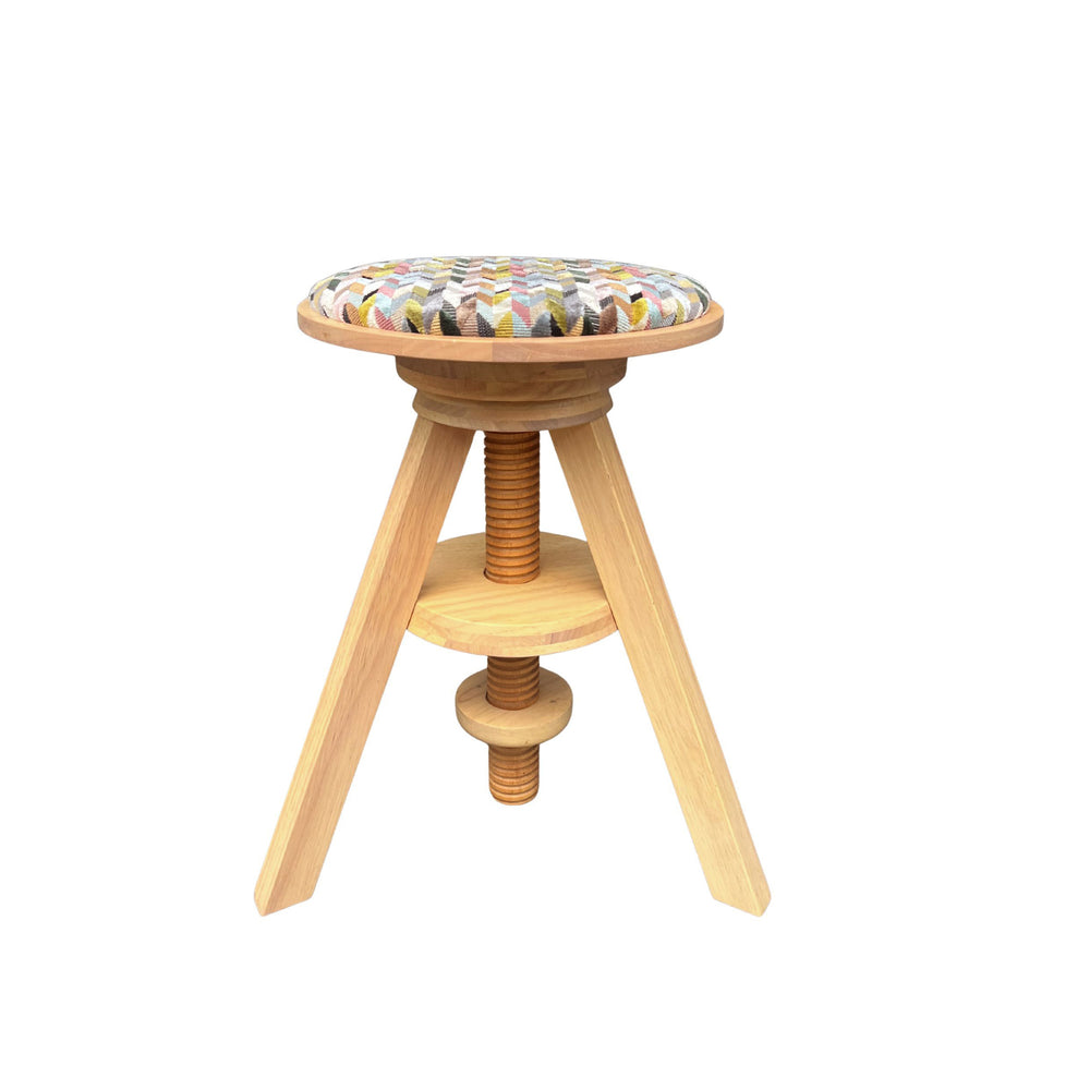 Handcrafted with precision, this adjustable wooden stool blends form and function. The seat features artisan fabric from Belgium, with multi-coloured cut-velvet and epingle chevron design, made from repurposed cuttings, each one unique.