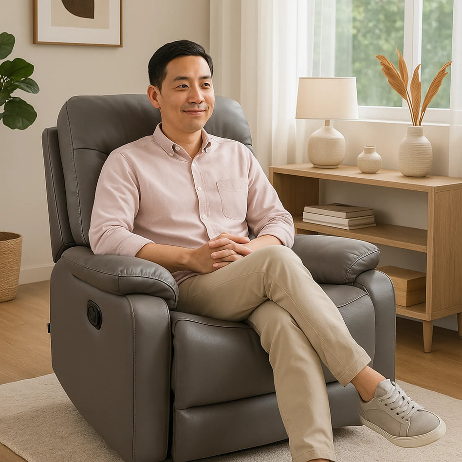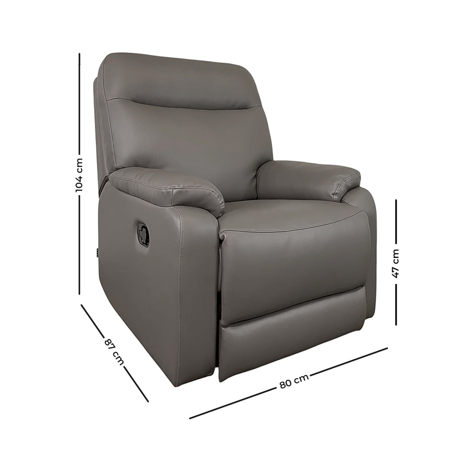 Zeus Recliner Armchair, crafted from premium faux leather, offers a sleek, modern design with ultra-comfortable cushioning. Its smooth reclining mechanism, ergonomic lumbar support, and built-in footrest provide a comfortable, stylish experience for movie nights or reading sessions.
