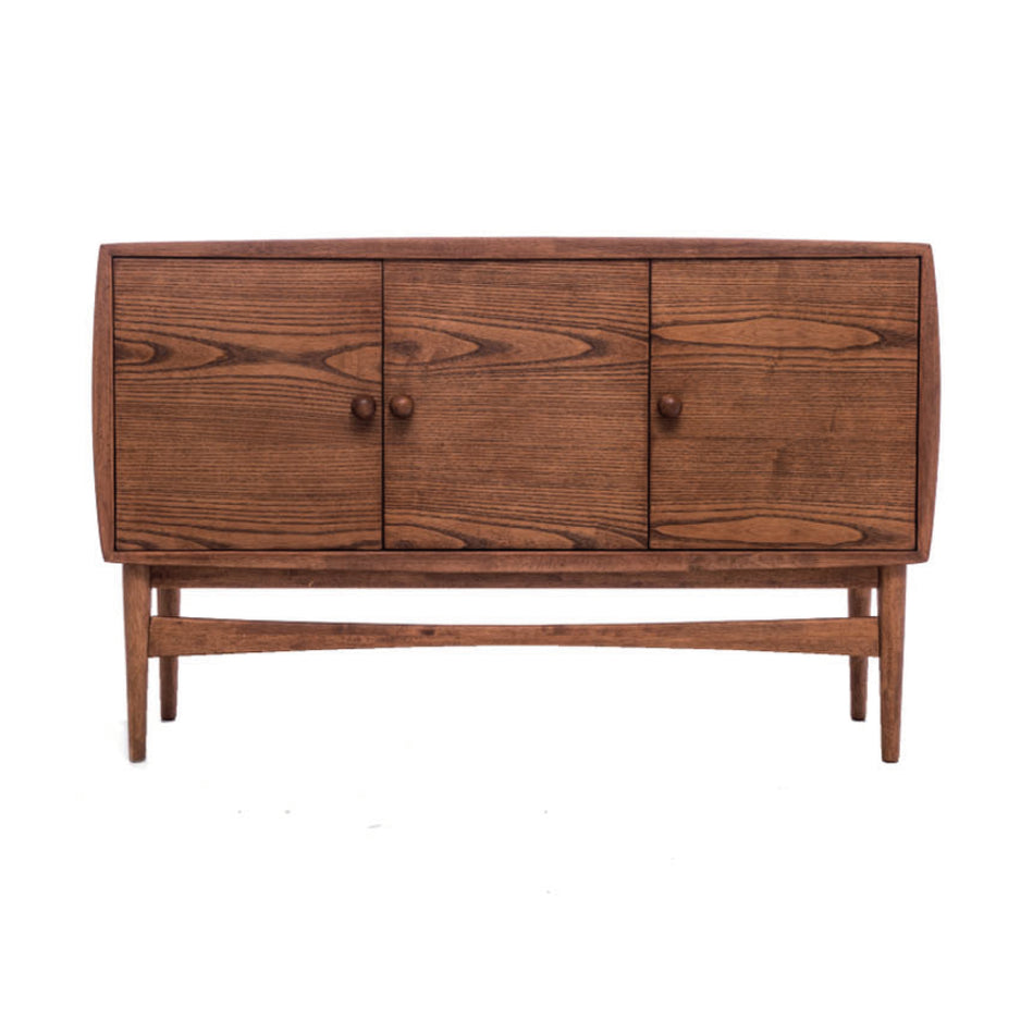FEATURES Classy Walnut finish 3 doors reveal shelving space Round Grey Color Door knob Durable Solid Walnut legs