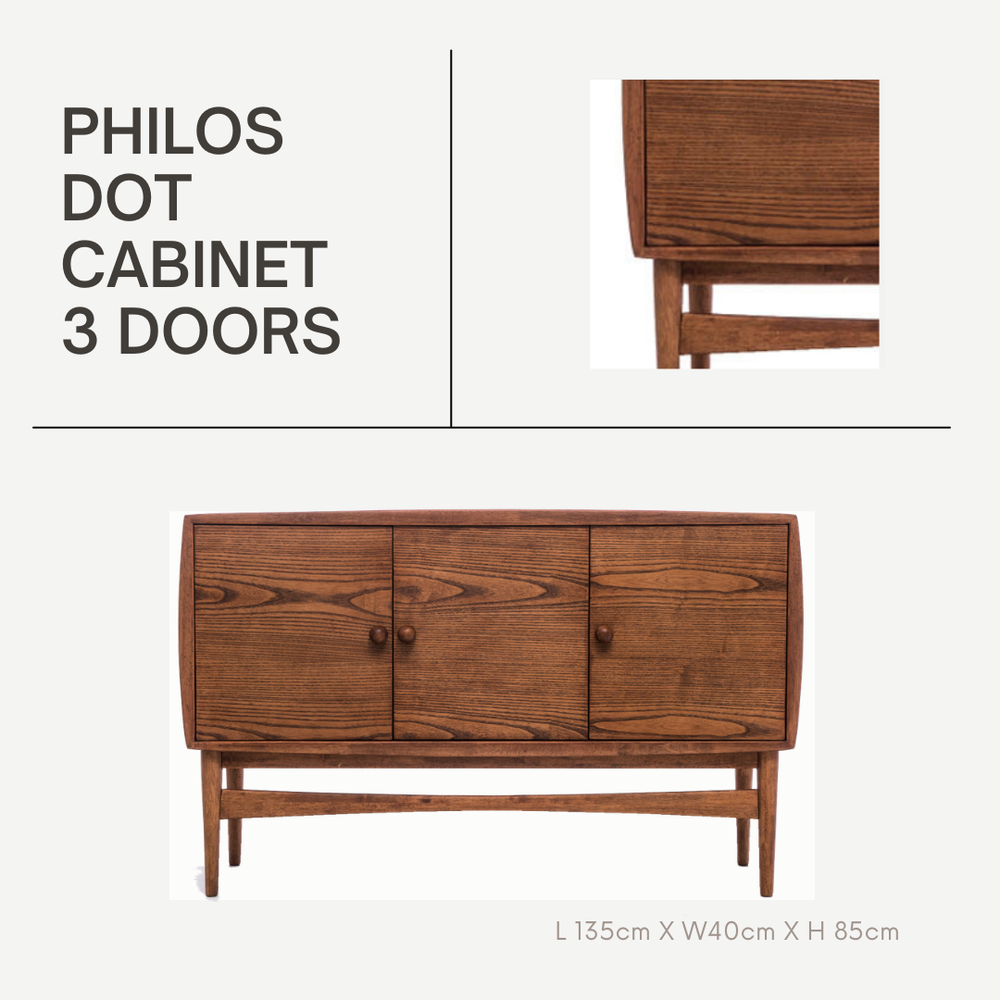 The ultimate in Retro inspired design where minimalism meets function with a playful sophistication, the Philos Dot Cabinet with 3 Door is a Mid-Century modern cabinet crafted from Solid Walnut. It has three closed compartments with round grey coloured drawer knobs to complete the Retro look. The classy Walnut finish gives this Cabinet a perfect look that will blend in any home decor theme.