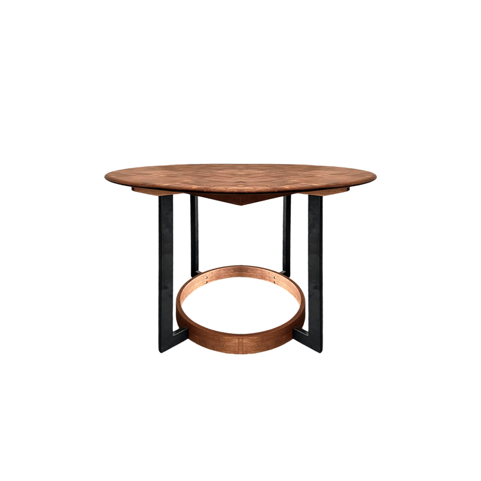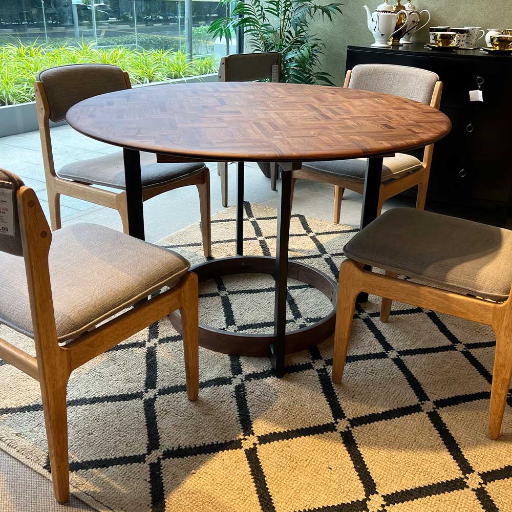 FEATURE Teak Herringbone Pattern Bevel Round Edges Stable and Sturdy Black Powder Coated Metal Base Stained in Dark Walnut Colour