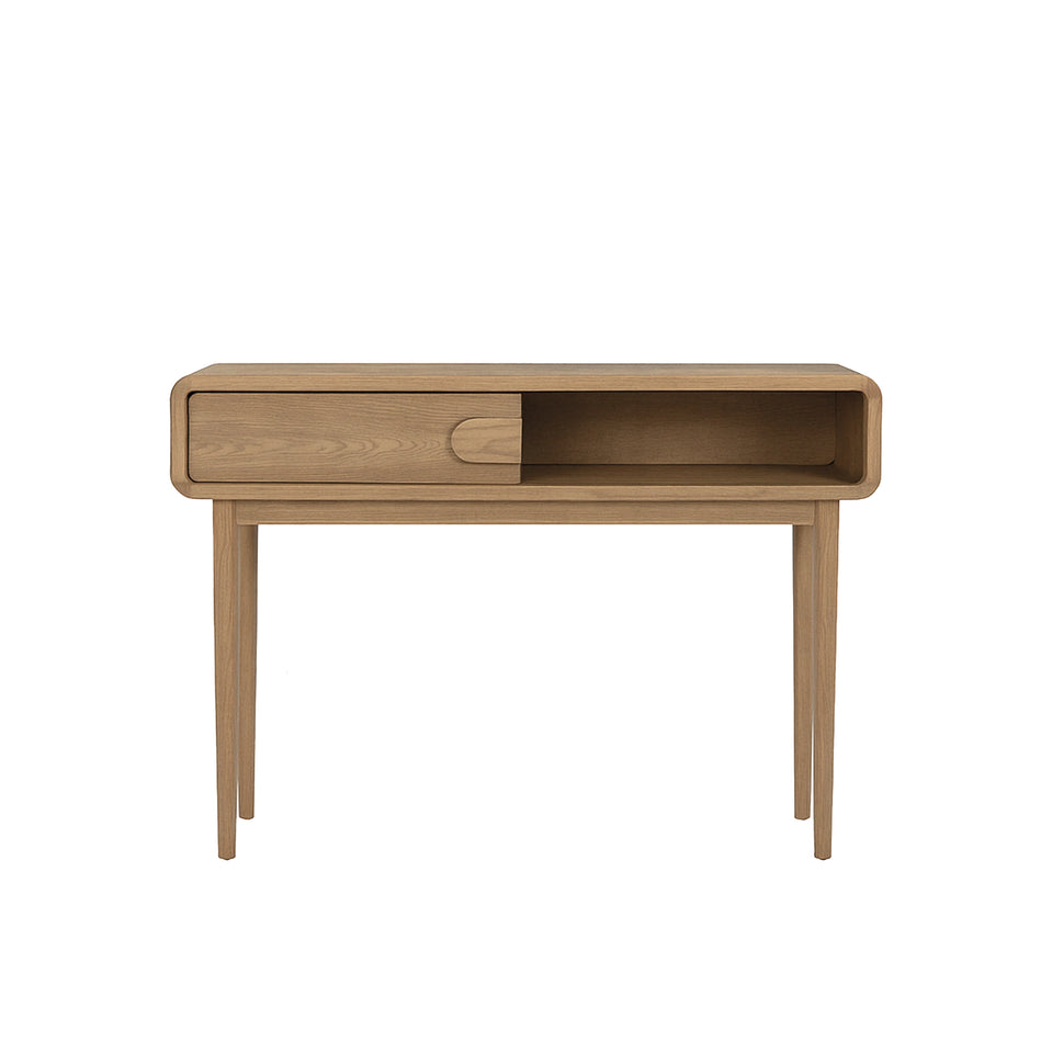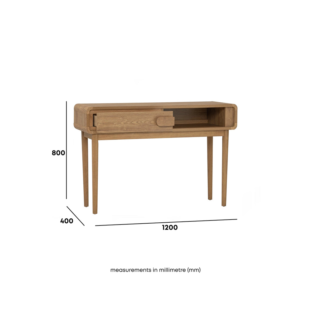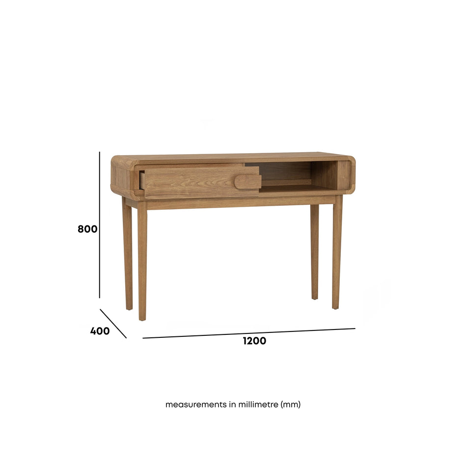 The Sora Console Table pairs clean lines with warm wood tones. Featuring a sliding door and open shelf, it offers smart storage in a slim form. Made with a laminated top and solid Malaysian oak legs perfect for entryways, living rooms, or hallways.