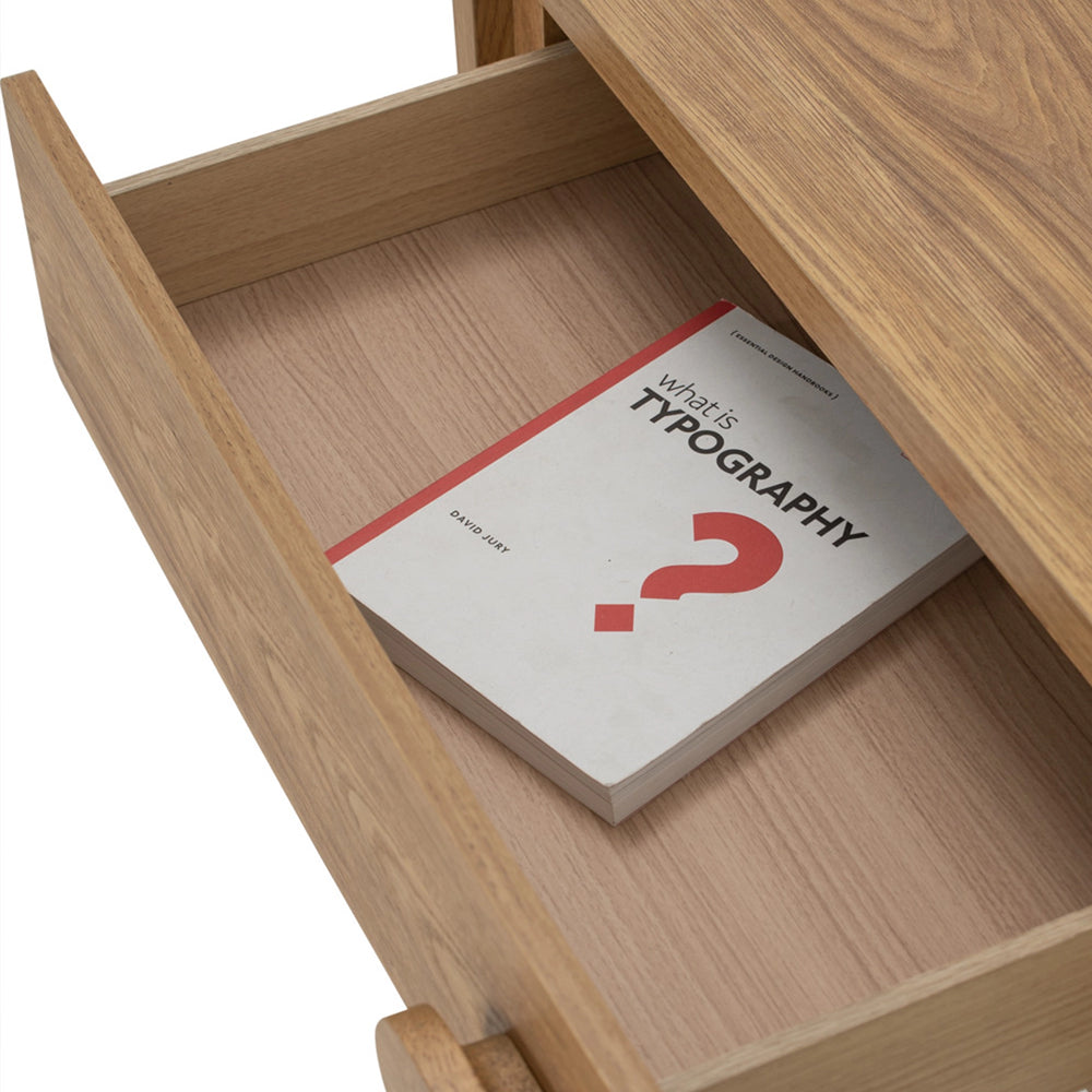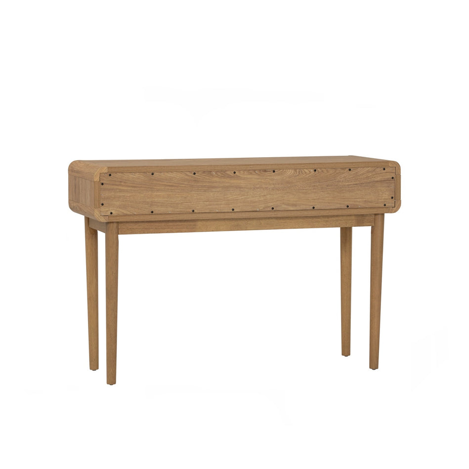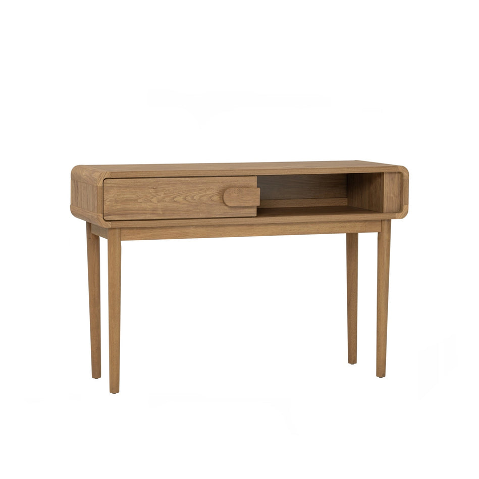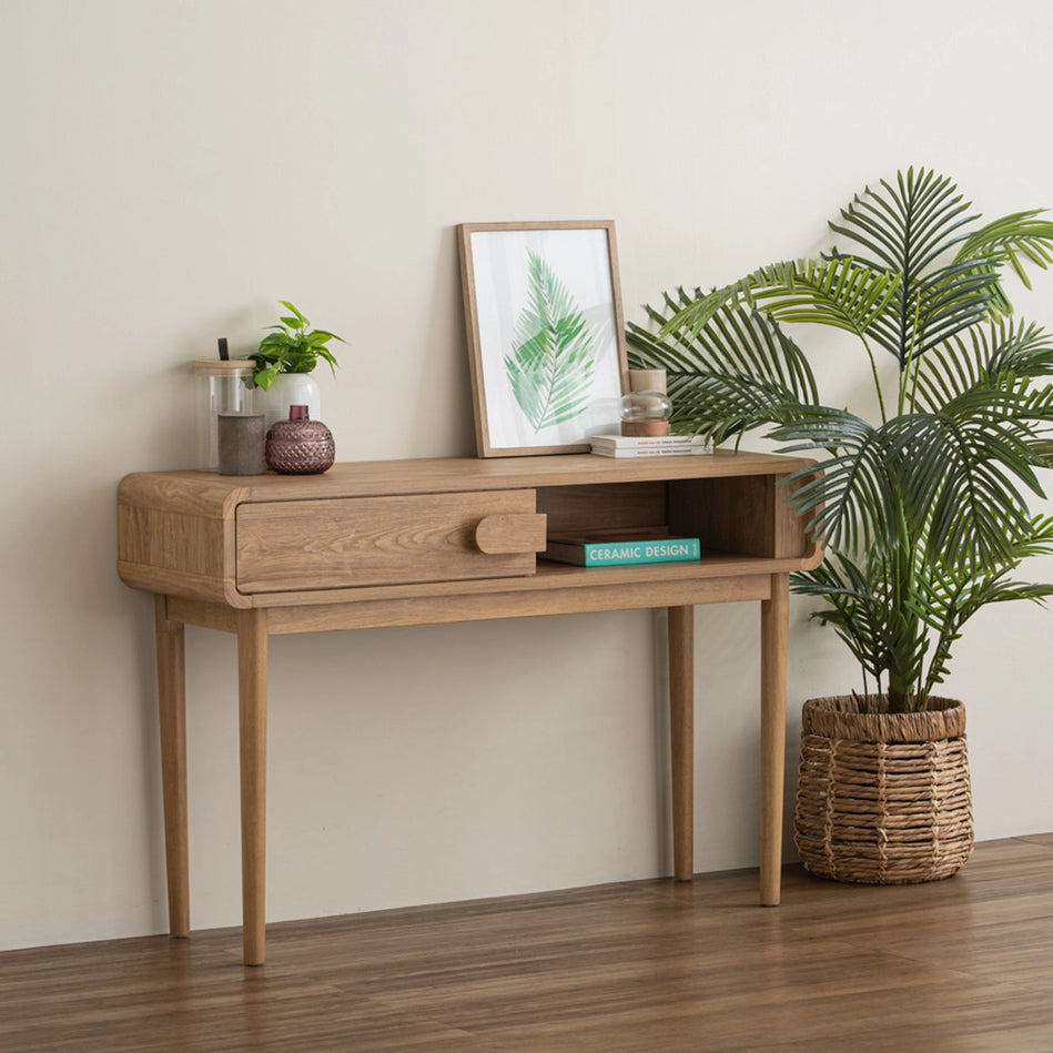 The Sora Console Table pairs clean lines with warm wood tones. Featuring a sliding door and open shelf, it offers smart storage in a slim form. Made with a laminated top and solid Malaysian oak legs perfect for entryways, living rooms, or hallways.