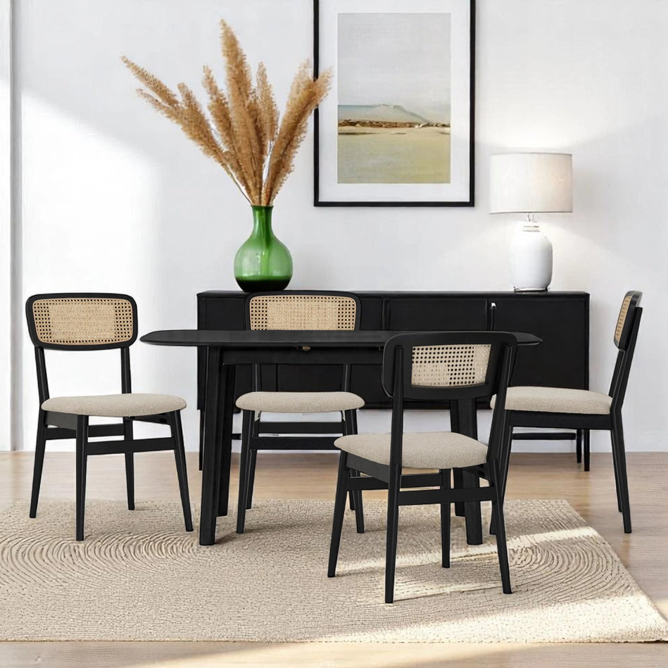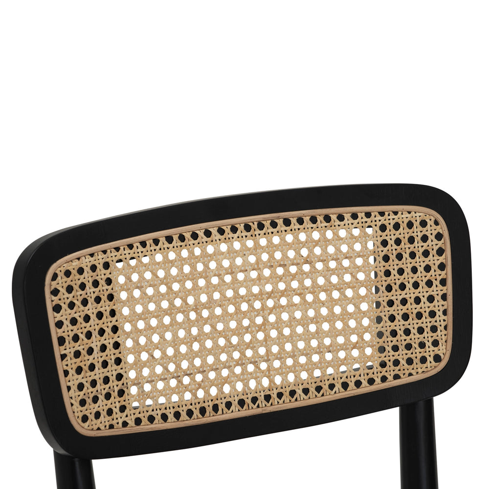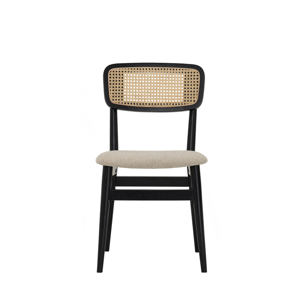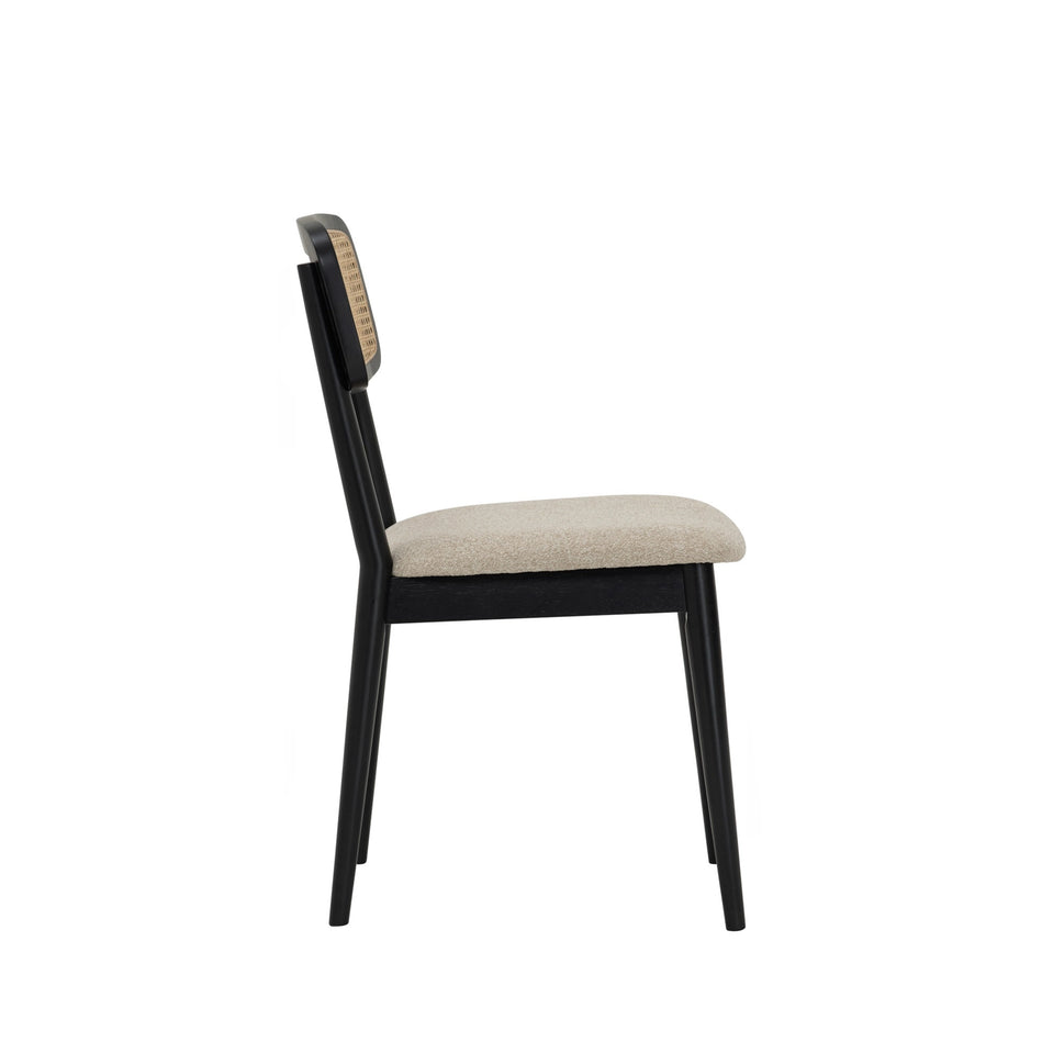 The Sora dining chair blends modern style with comfort. Featuring a sleek black wooden frame and a breathable woven rattan backrest, its cushioned beige fabric seat offers plush support. Ideal as a modern dining chair, kitchen chair, or cafe seating, this Scandinavian-inspired chair adds elegance to any dining room or living space. Durable, timeless, and perfect as an accent or side chair.